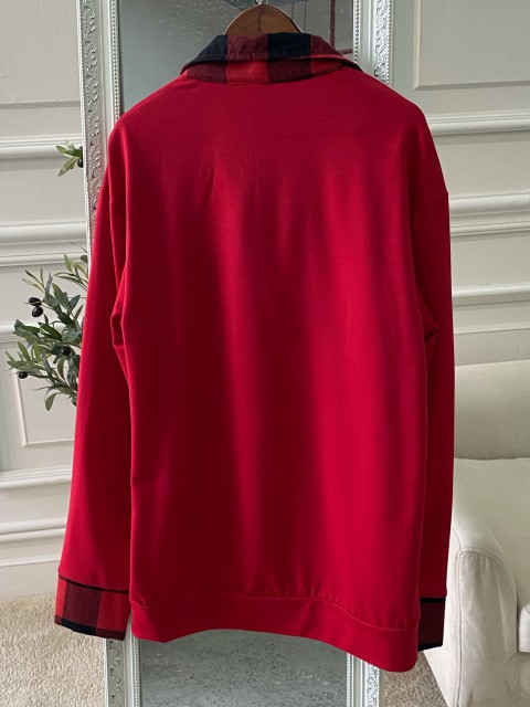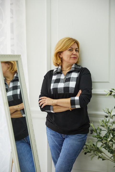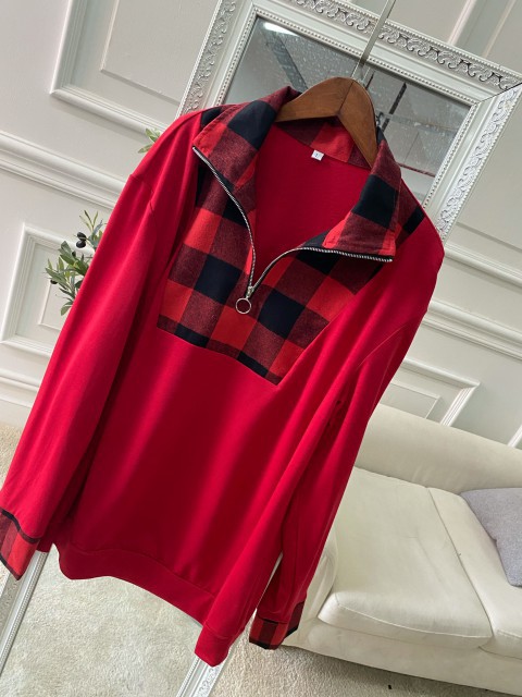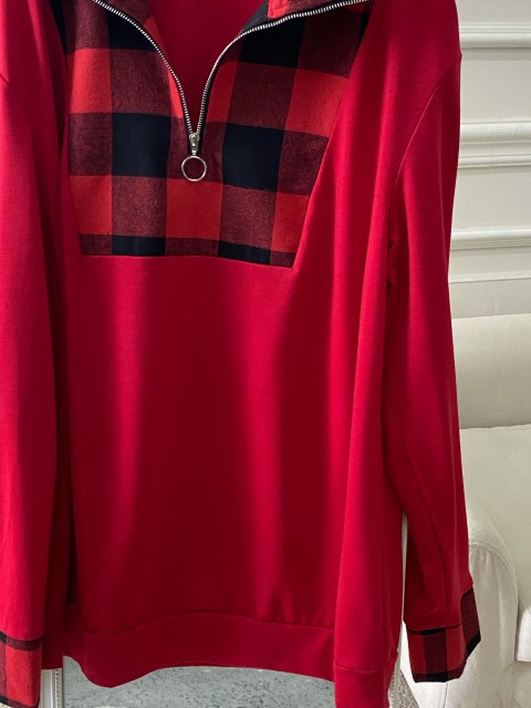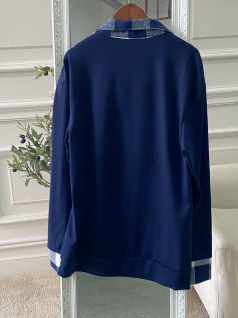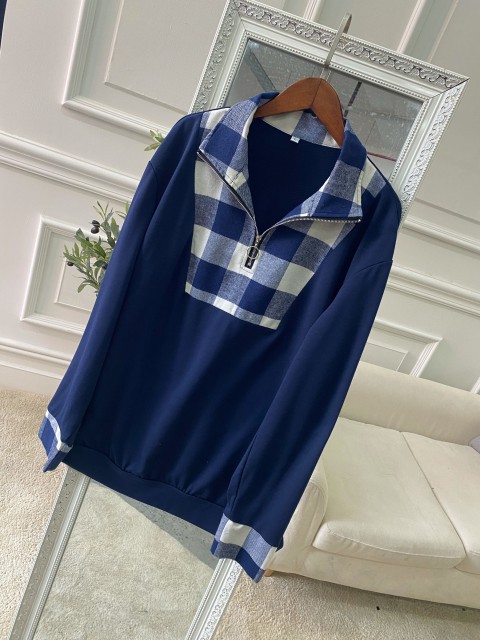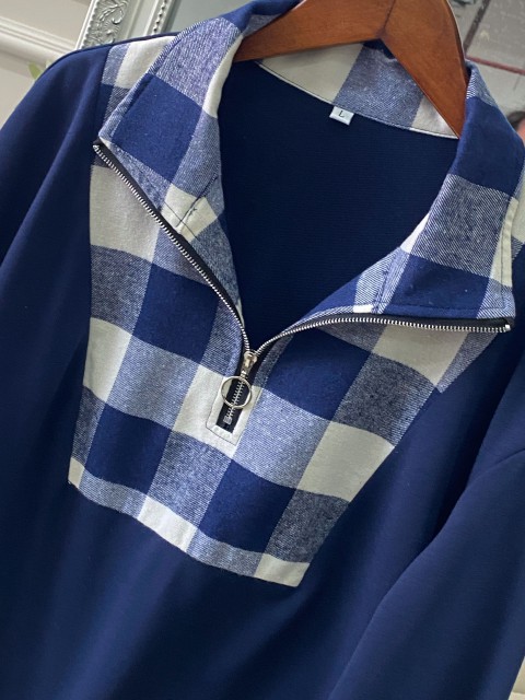 Wrap yourself in cozy elegance with this navy sweatshirt. Featuring a trendy drop sleeve design, it showcases a chic patchwork of geometric plaid on the front, complemented by a stylish ring zipper. The turn-down collar adds a touch of sophistication, making it an ideal choice for casual outings and everyday comfort.