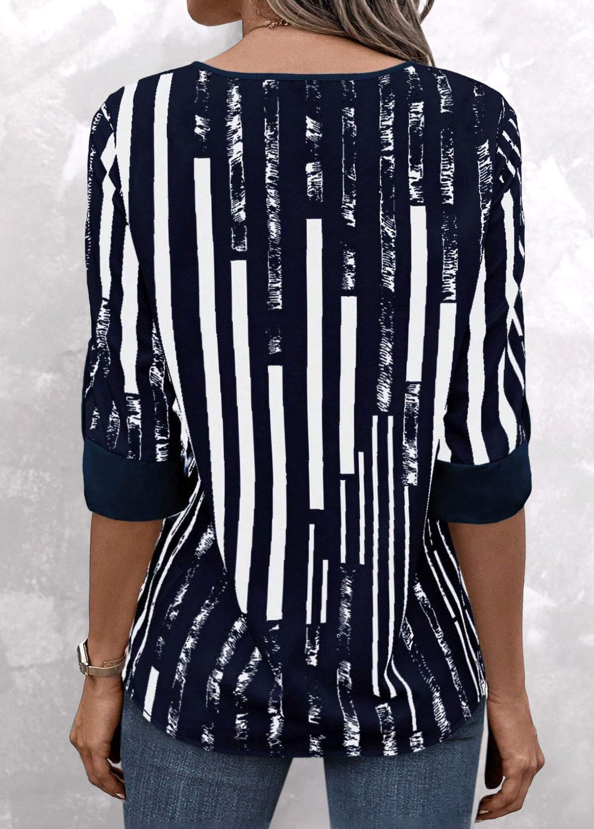 Blue Striped 3/4 Sleeve Split Neck Shirt