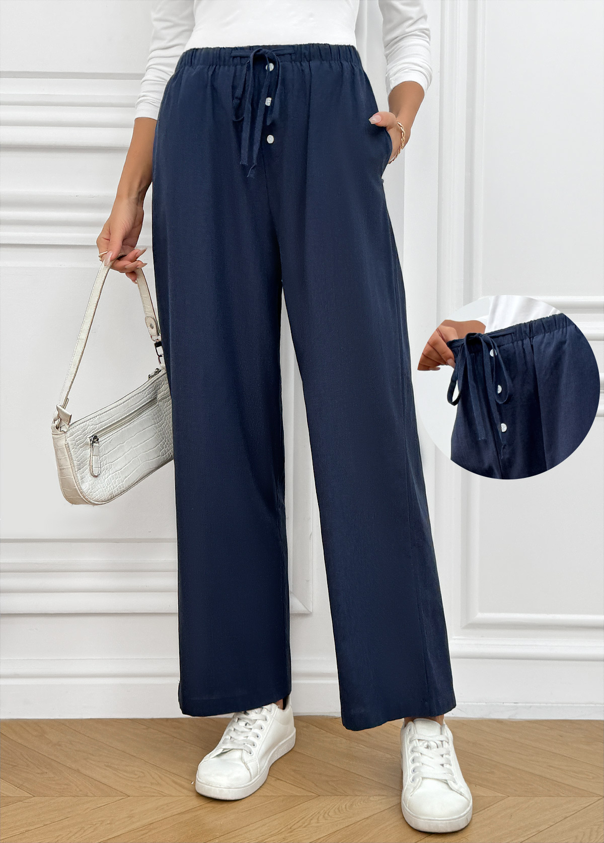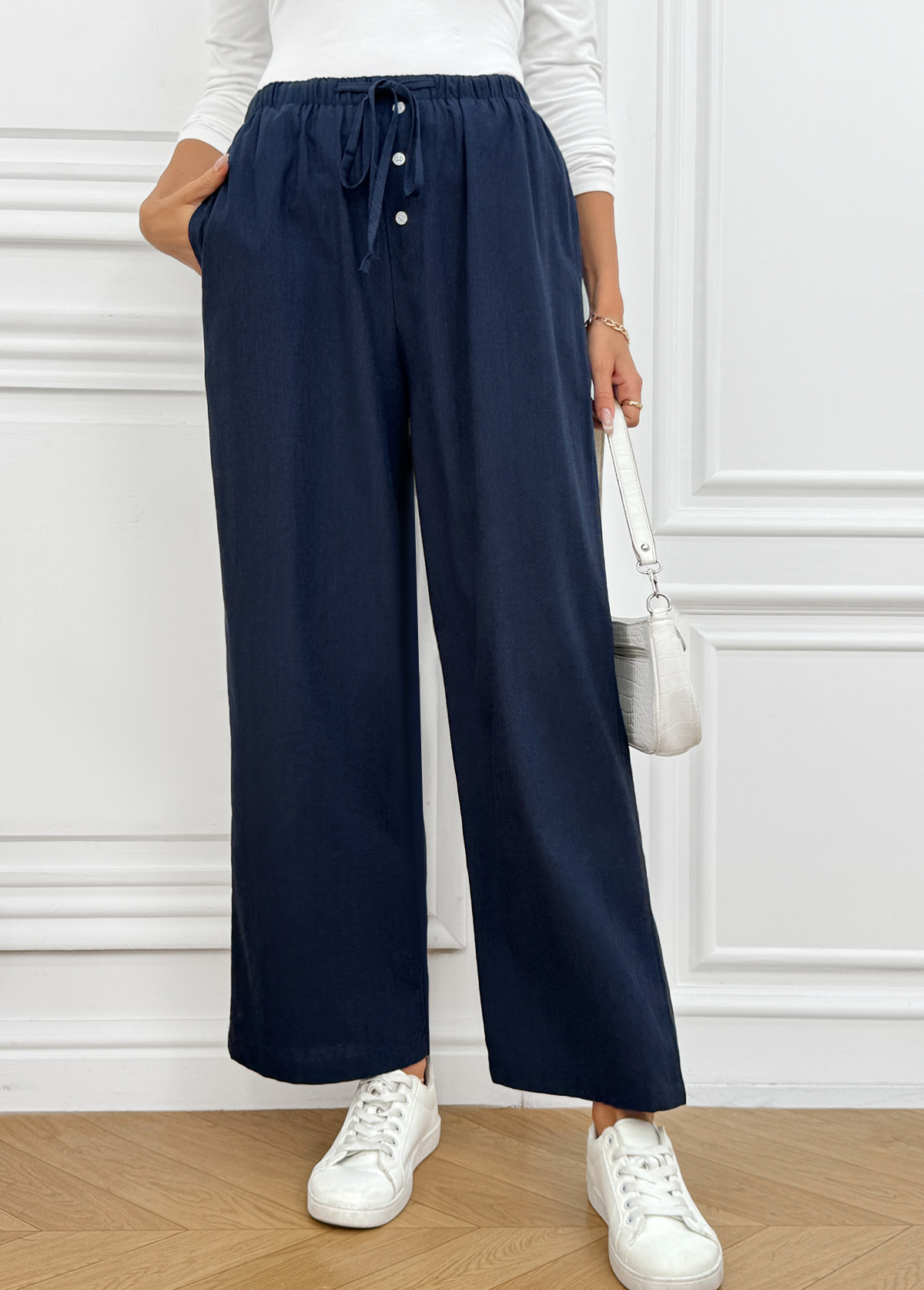 • Navy Pocket Wide Leg Elastic Waist High Waisted Pants