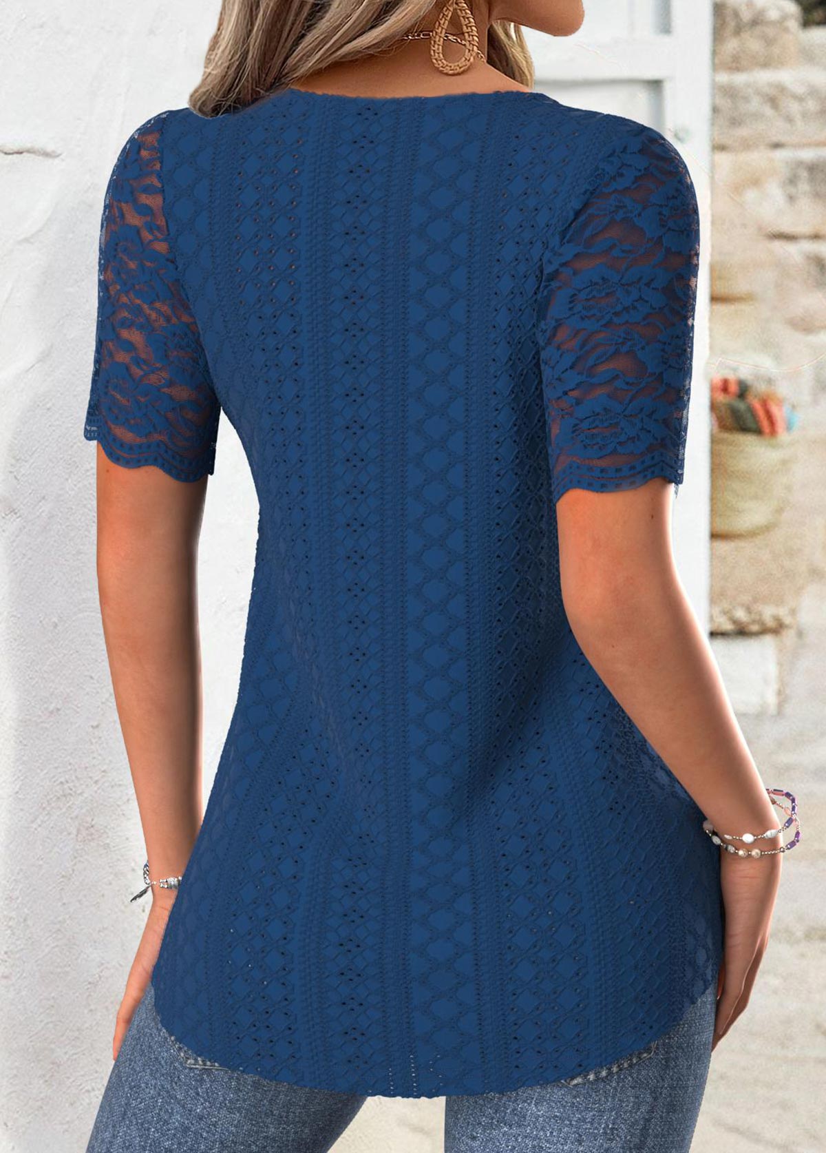 Navy Lace Short Sleeve Tie Collar T Shirt