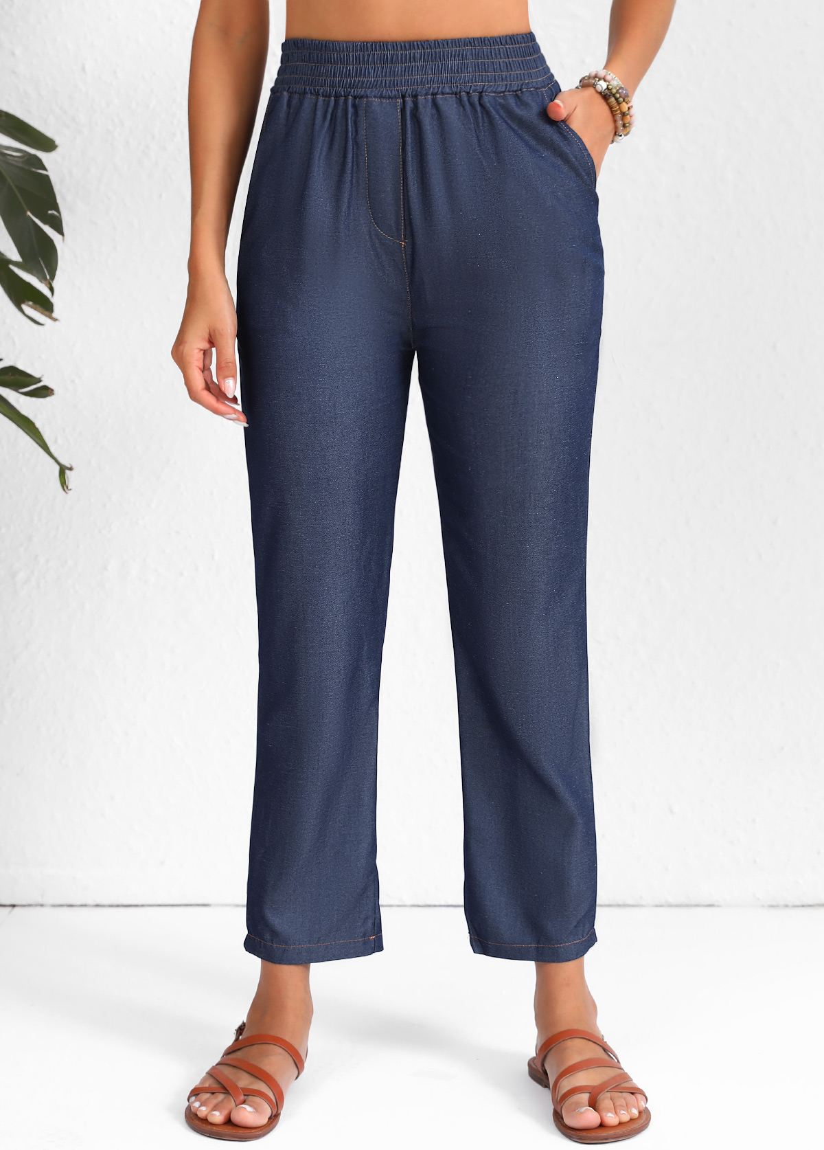 women's clothes / Bottoms / Pants  /  Navy Smocked Elastic Waist High Waisted Pants