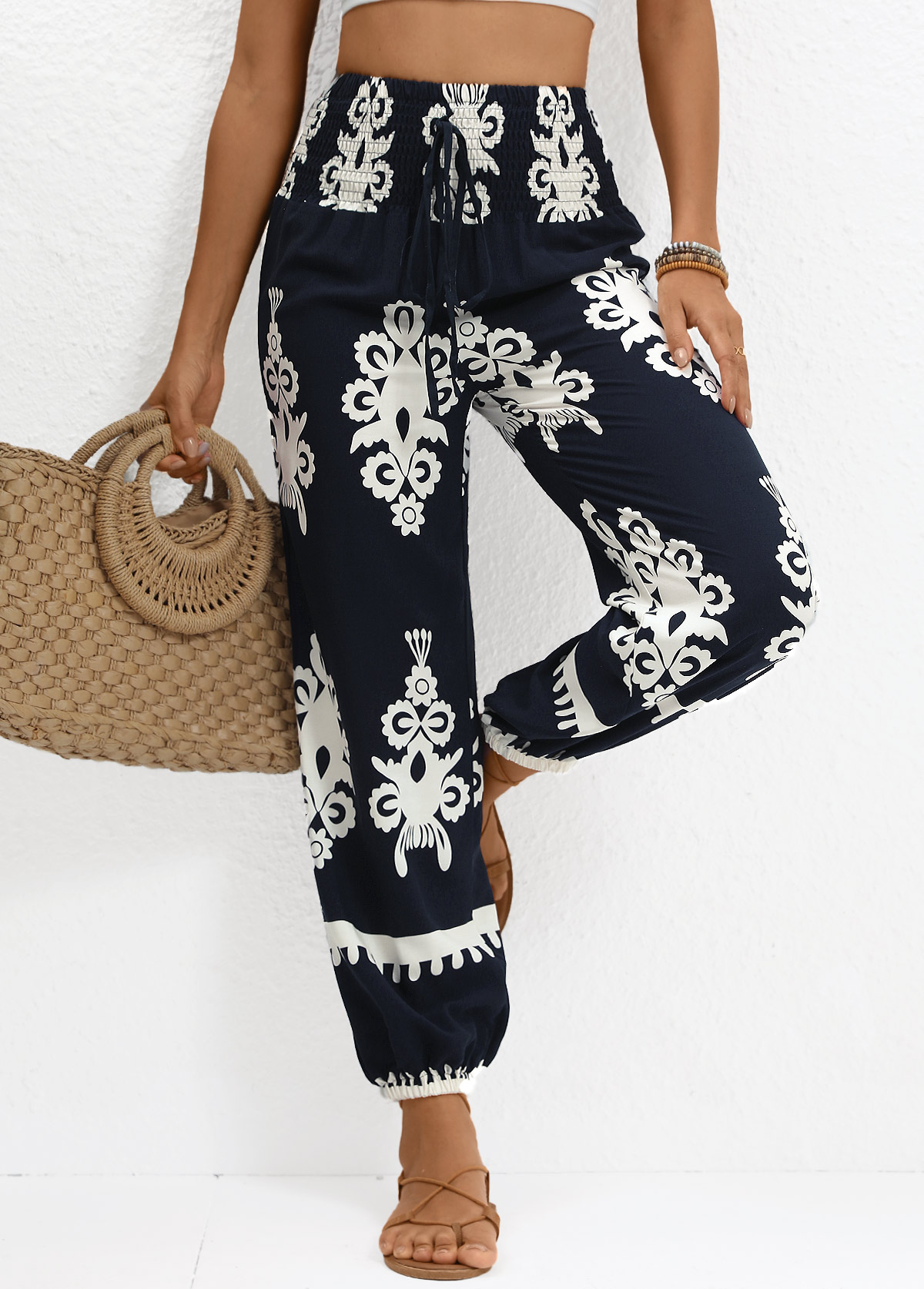 women's clothes / Bottoms / Pants  /  Navy Smocked Tribal Print Jogger Elastic Waist Pants