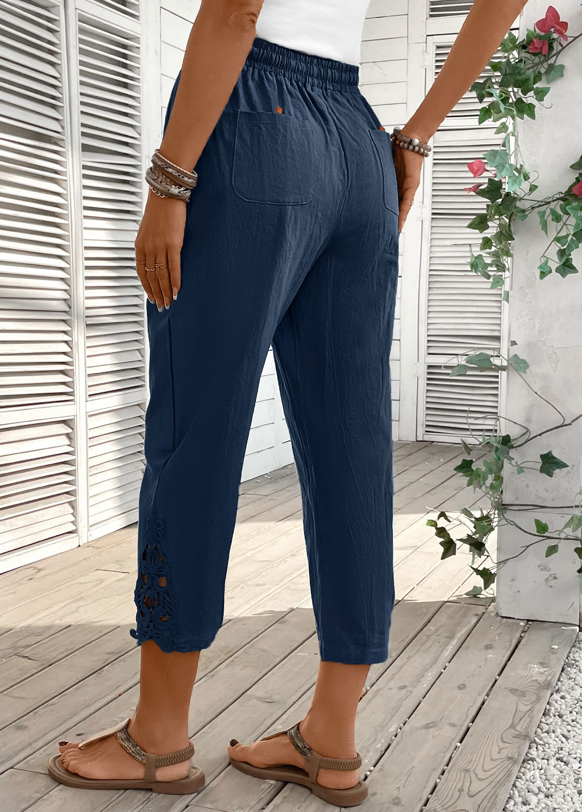 I feel so comfortable in these pants. The soft material and high-waisted design make them perfect for any casual occasion.
