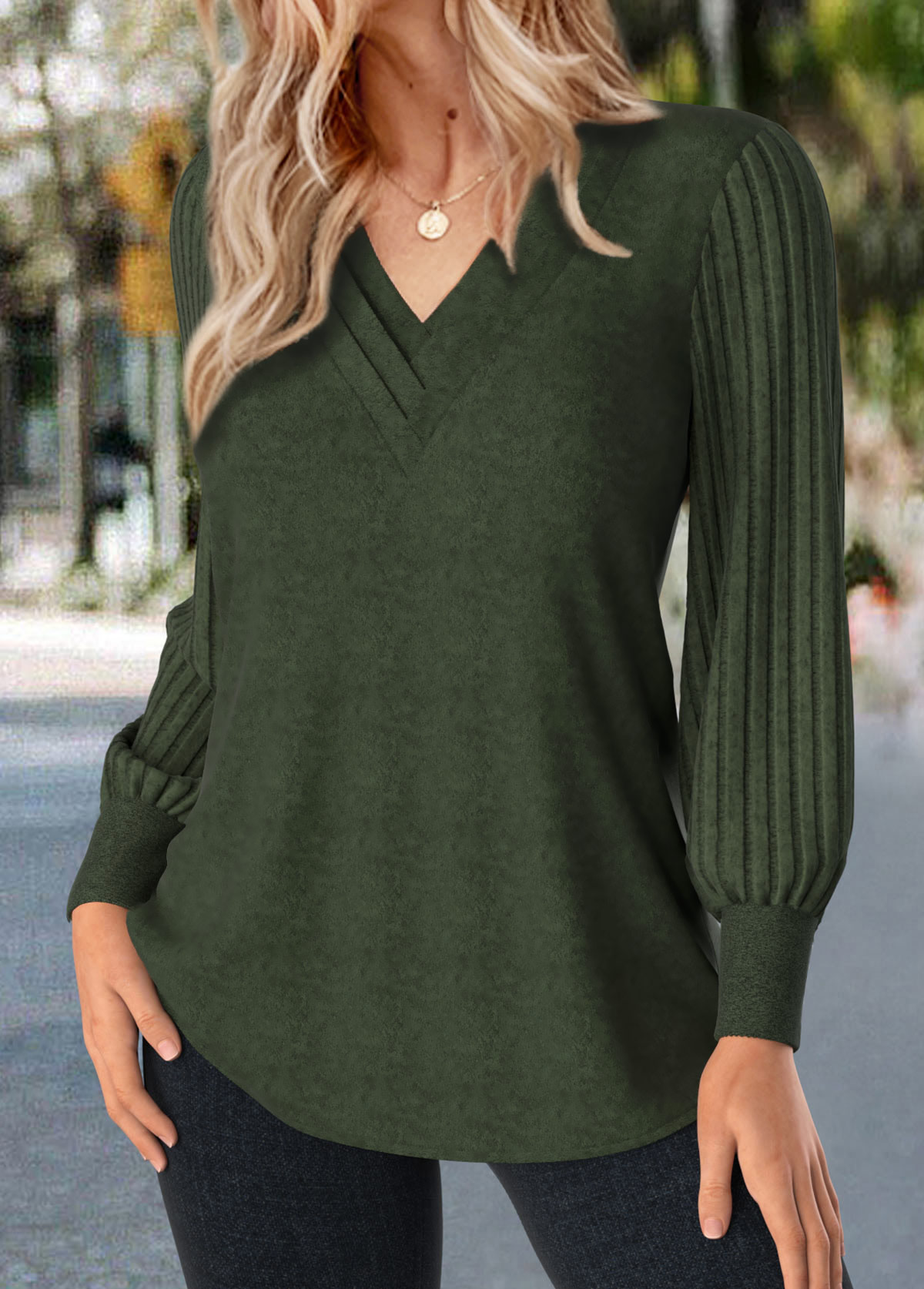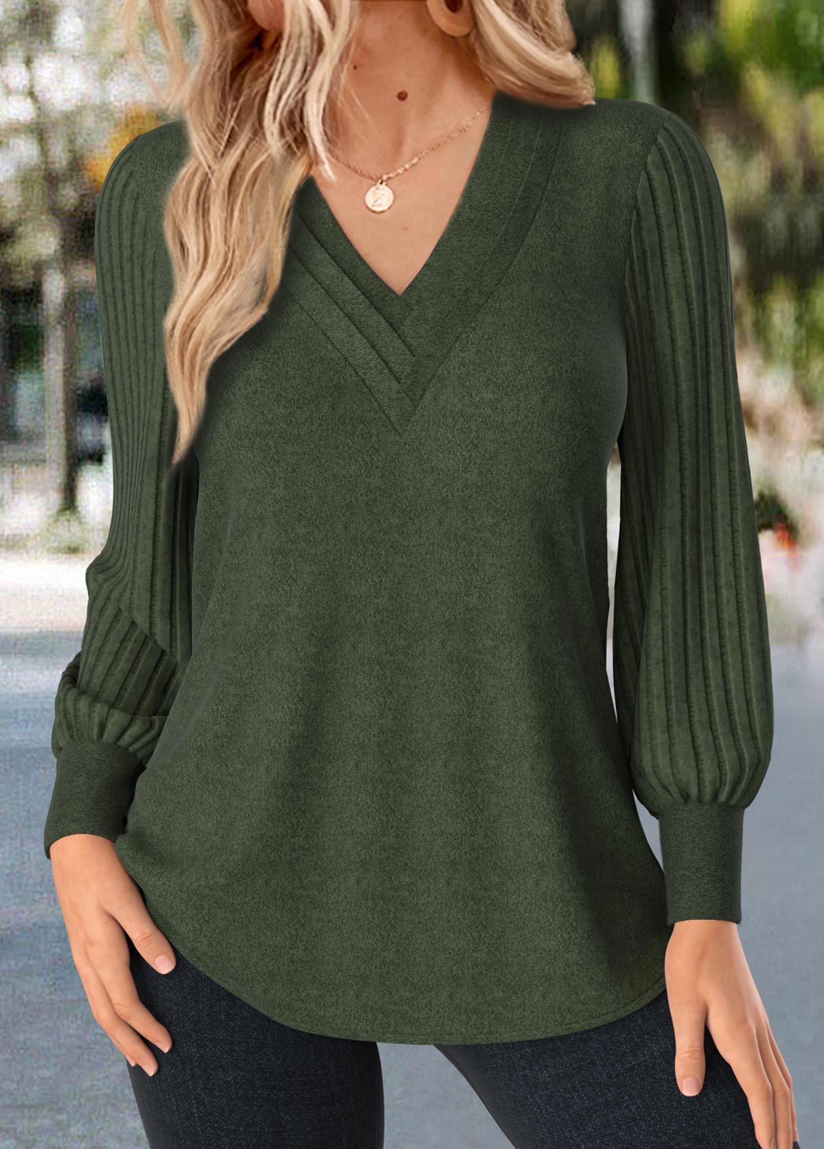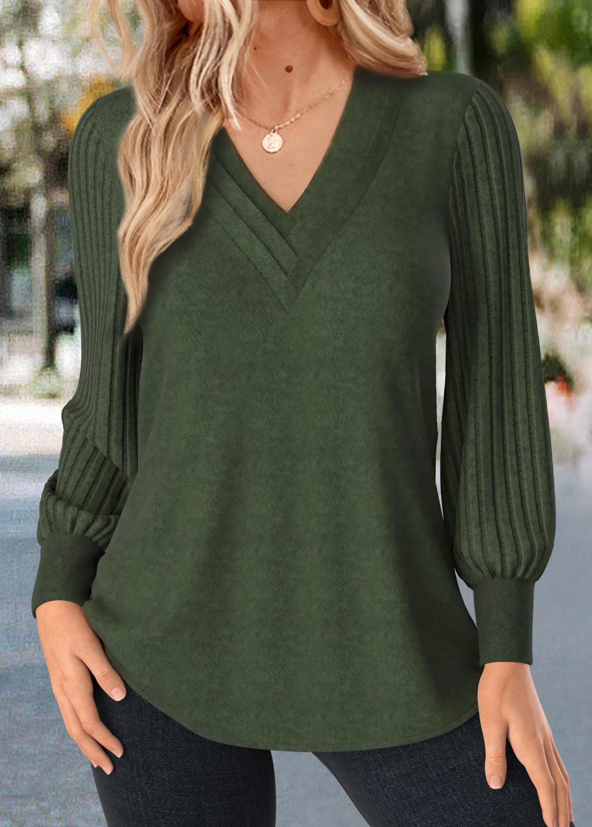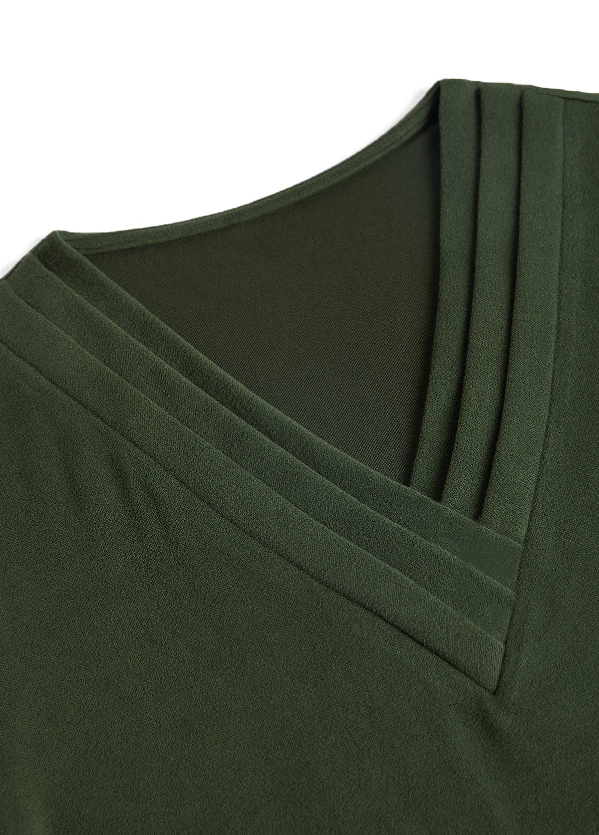 Embrace effortless style with this olive green V-neck T-shirt, featuring trendy bishop sleeves that add a touch of flair. Its unique patchwork design combines soft, comfortable fabric for a relaxed fit, while providing tummy coverage for confidence. Perfect for everyday wear, this tee blends fashion and comfort seamlessly.