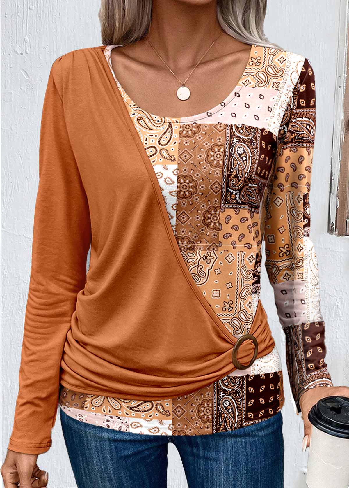 women's clothes / Tops / Tees&T-shirts  /  Orange Asymmetry Patchwork Long Sleeve T Shirt