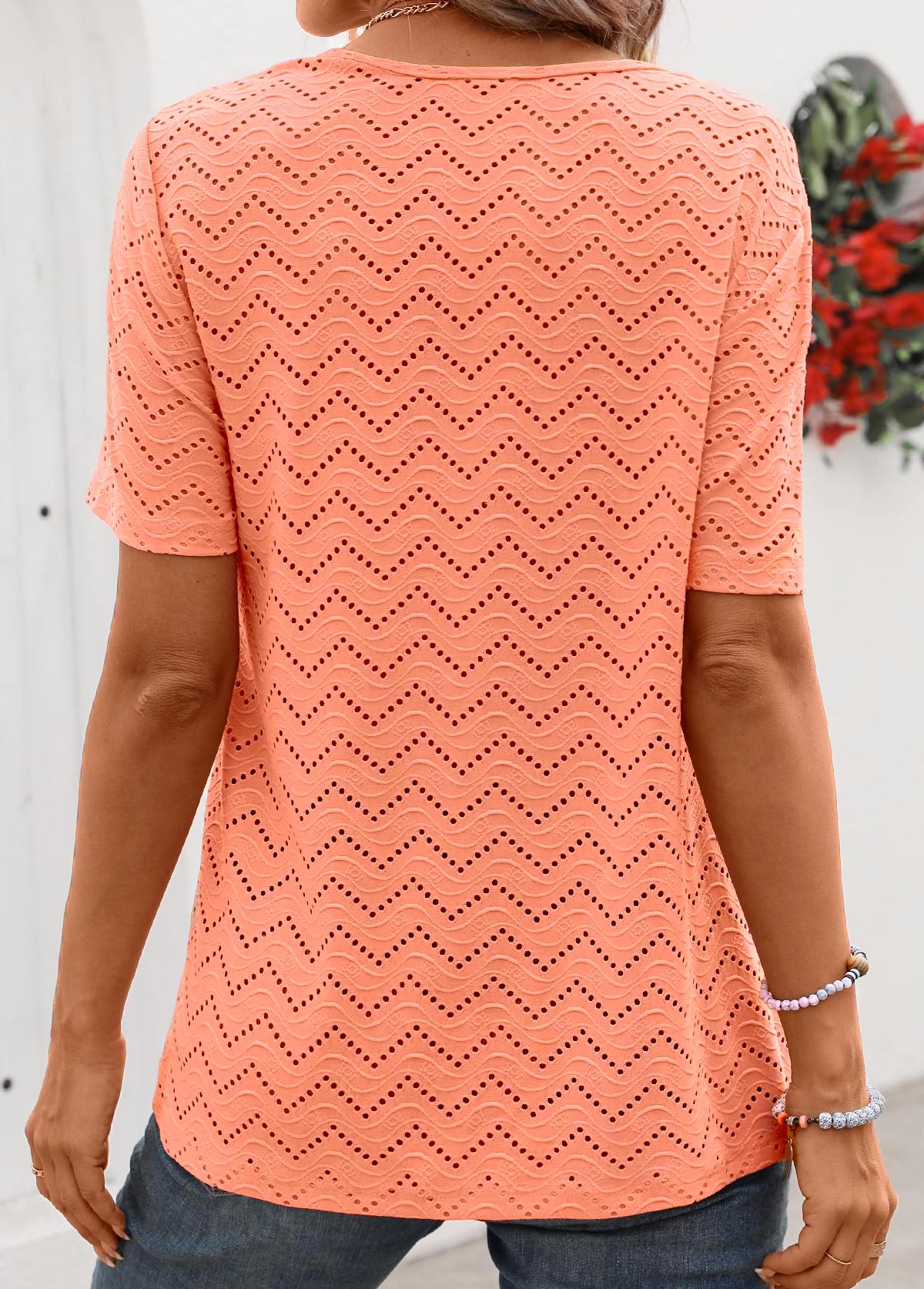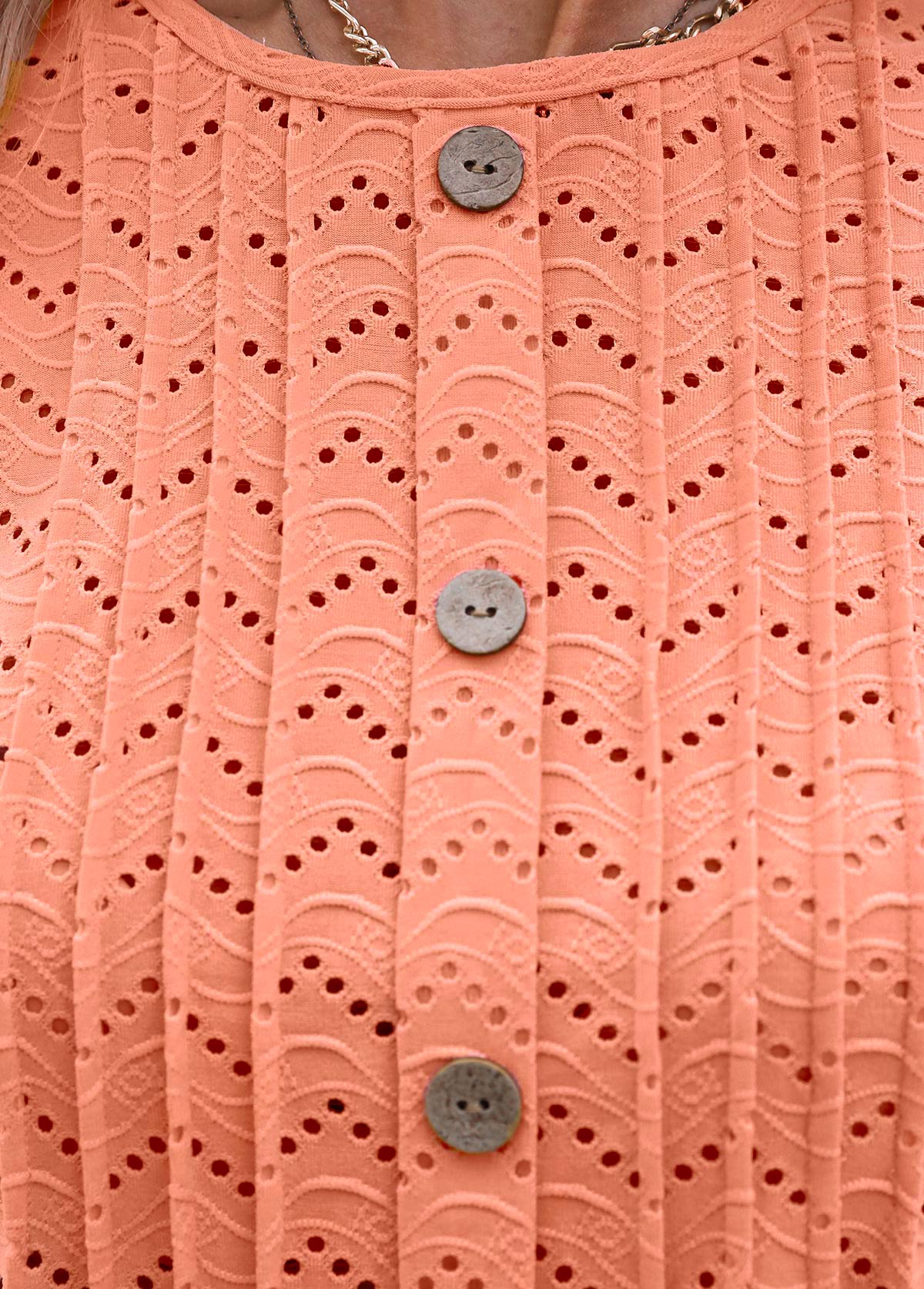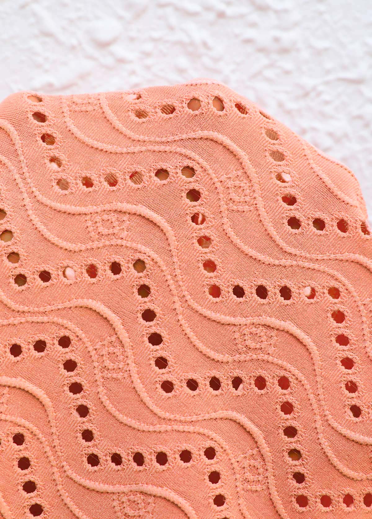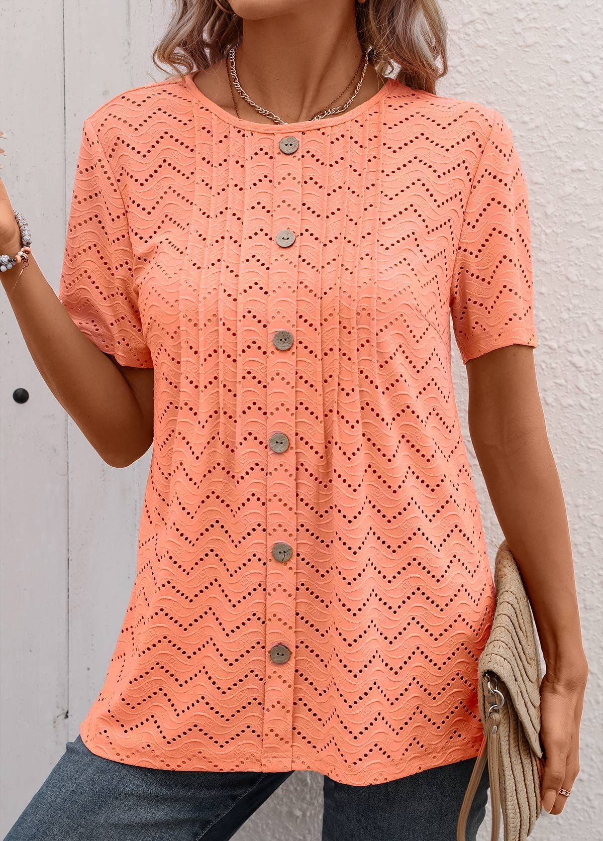 It's a must-have for casual everyday wear, vibrant in orange hue, featuring a delightful tummy coverage function. Delicate tucks accentuate graceful contours, while the jacquard fabric offers a refreshing touch. Its unique button design exudes a sense of fashion, and the cleverly placed tiny perforations provide added breathability and comfort.