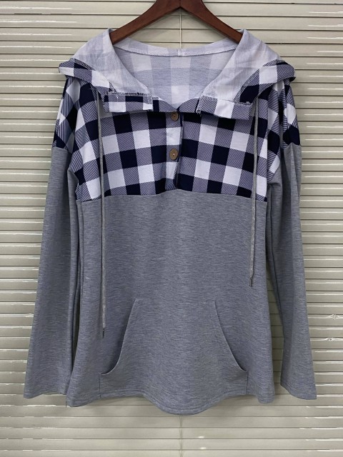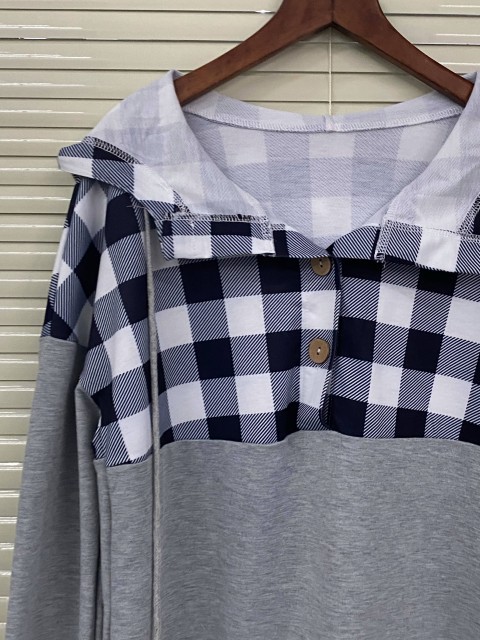 Purple Button Plaid Long Sleeve Split Neck Sweatshirt