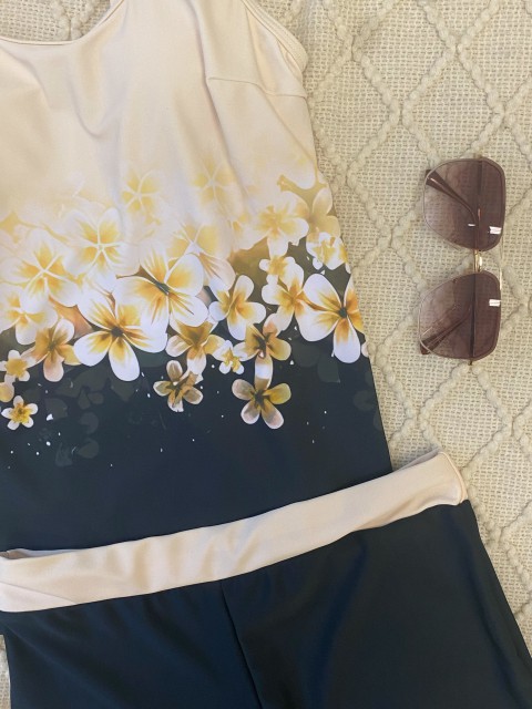 Tummy Coverage Tropical Plants Print Black Tankini Top