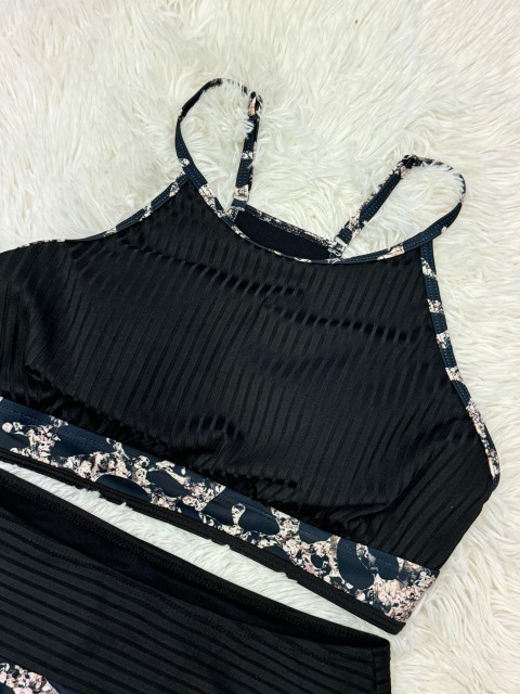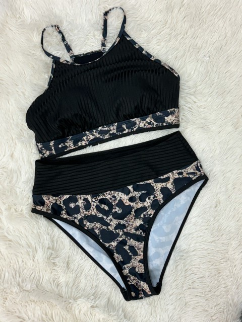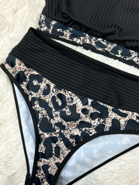 Turn heads with this striking black bikini set featuring bold leopard print accents. The set includes a bra top and a pair of cheeky bottoms. The top comes with removable padding and adjustable straps, ensuring a perfect fit. Designed with high elasticity, this form-fitting bikini enhances your curves beautifully, making it perfect for a beach vacation.