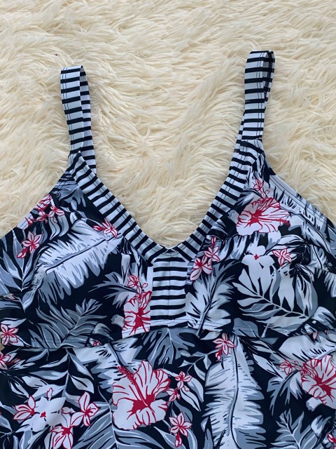Tummy Coverage Tropical Plants Print Black Tankini Top