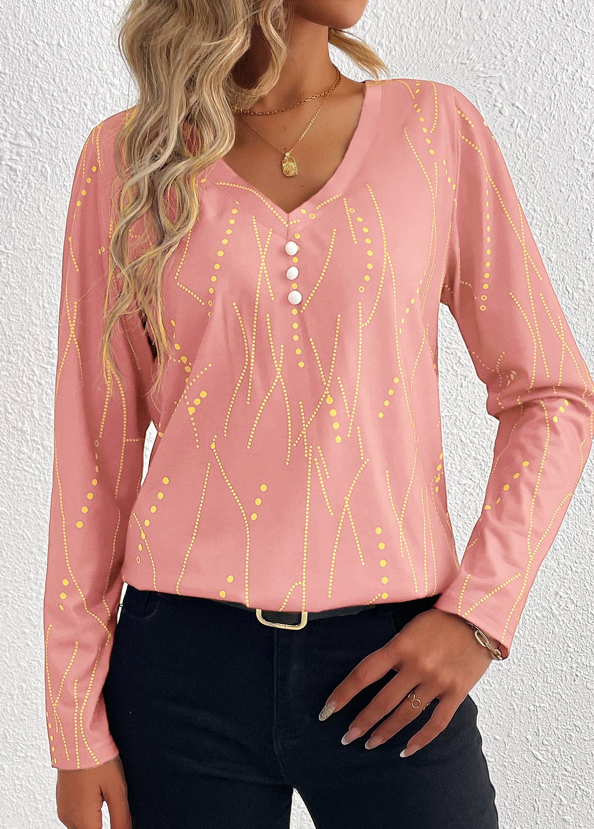 women's clothes / Tops / Tees&T-shirts  /  Pink Button Geometric Print Long Sleeve T Shirt