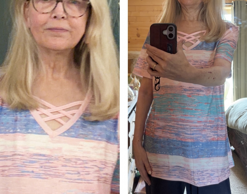 Get ready to spice up your casual wardrobe with our playful mixed-stripe V-neck short-sleeve T-shirt! Featuring a stylish criss-cross design at the chest and contrast binding for a pop of color, it's perfect for everyday leisure. With its flattering silhouette and tummy coverage, this tee adds a fun twist to your look.