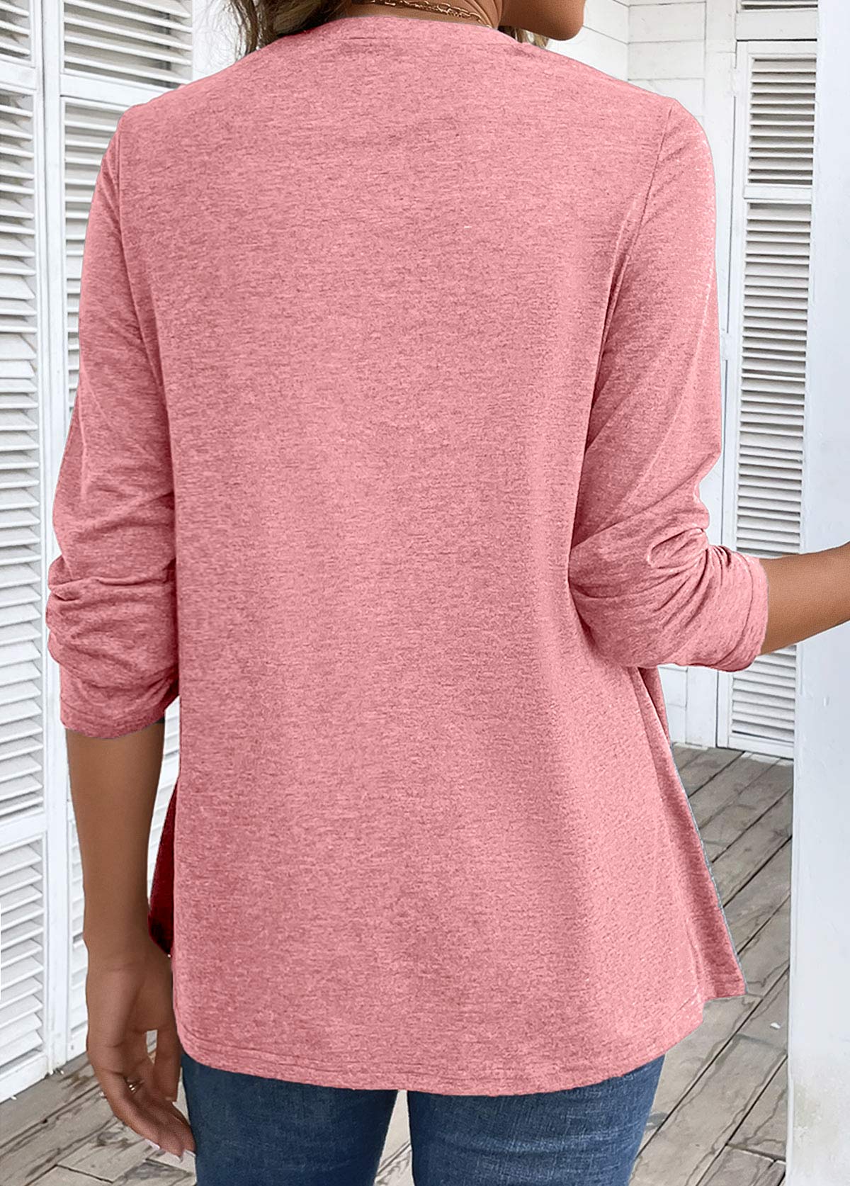 Pink Curved Hem Long Sleeve Turn Down Collar Shirt