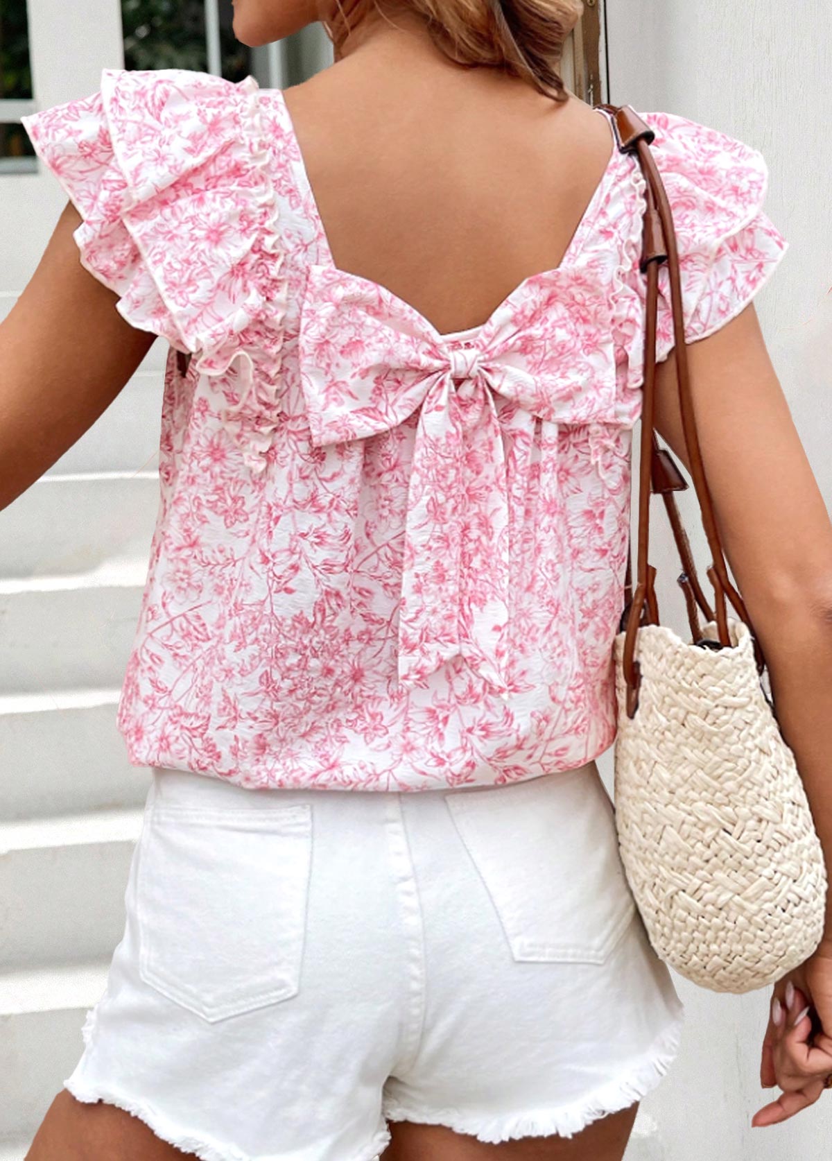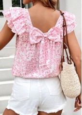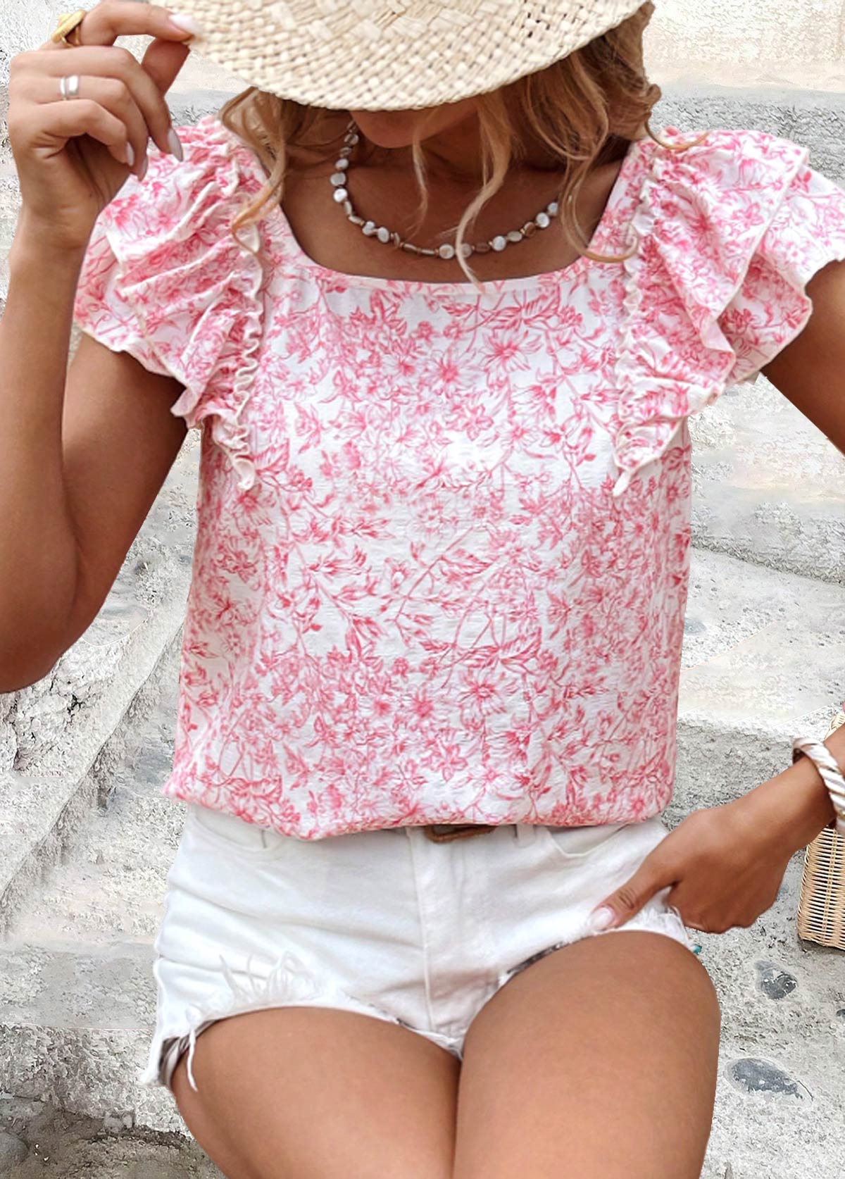 Dusty Pink Floral Print Frill Short Sleeve T Shirt
