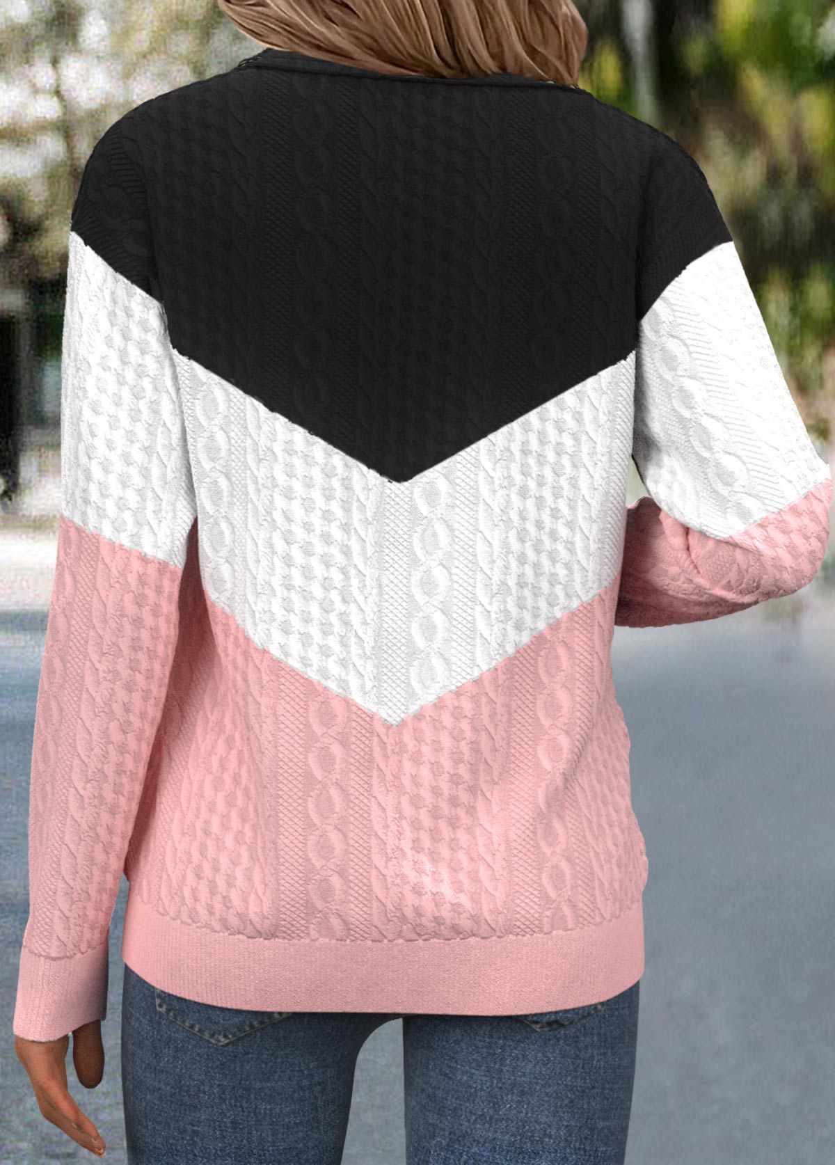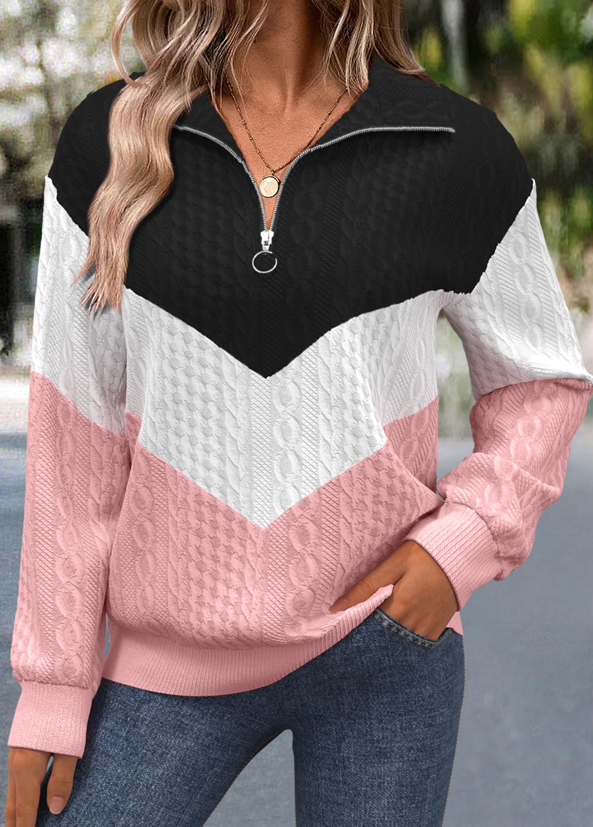 women's clothes / Tops / Sweatshirts&Hoodies  /  Pink Jacquard Long Sleeve Turn Down Collar Sweatshirt