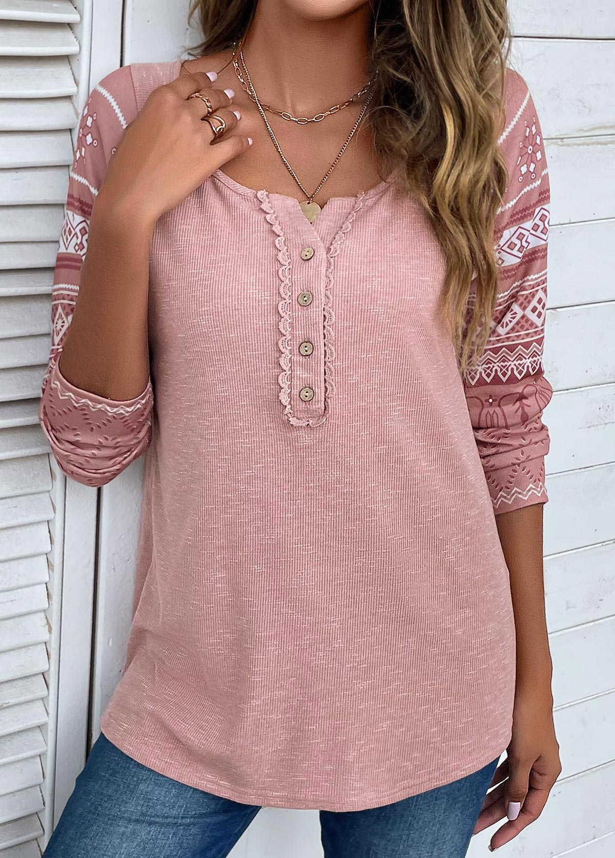 women's clothes / Tops / Tees&T-shirts  /  Pink Lace Tribal Print Long Sleeve T Shirt