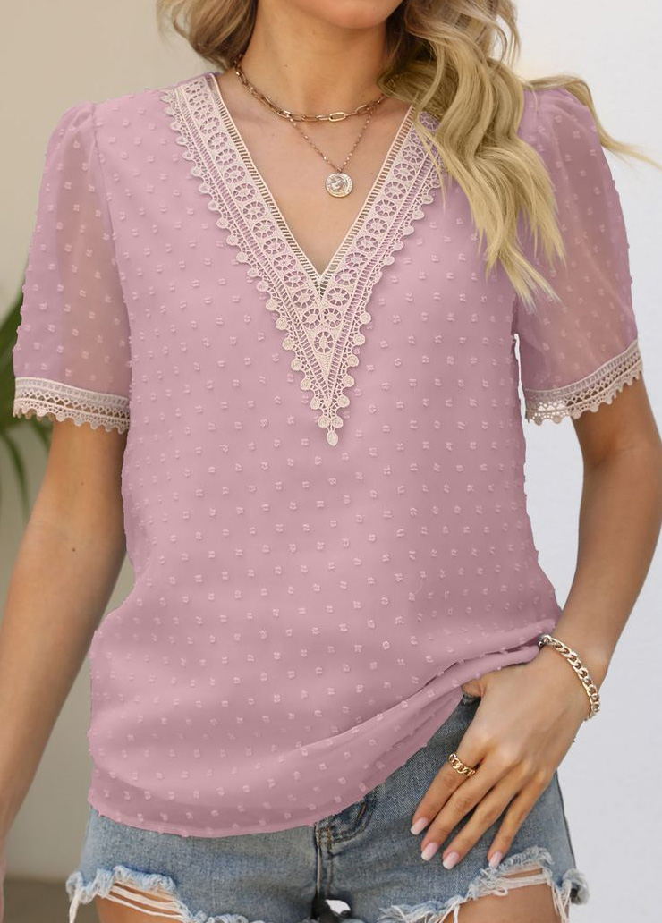 Light Pink Patchwork Short Sleeve V Neck T Shirt