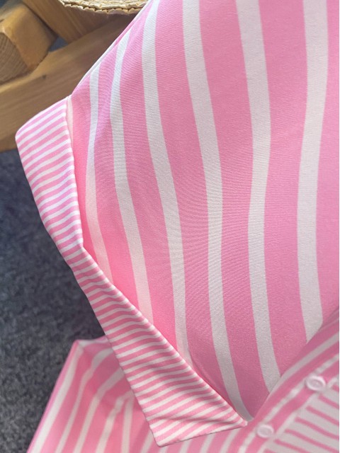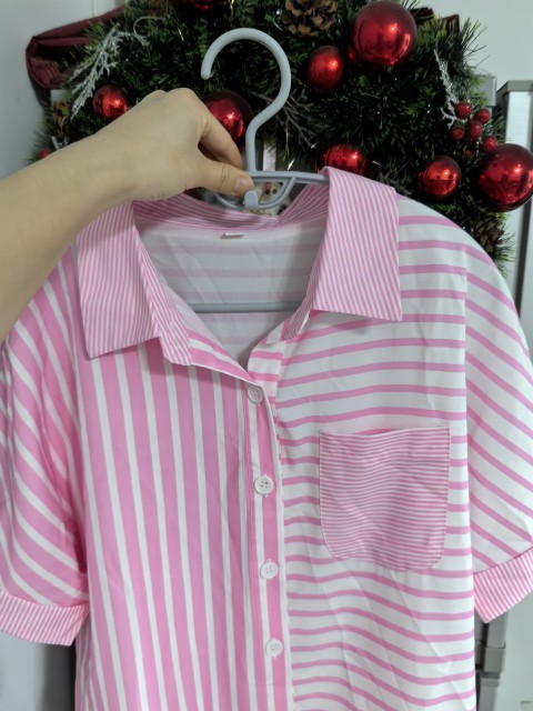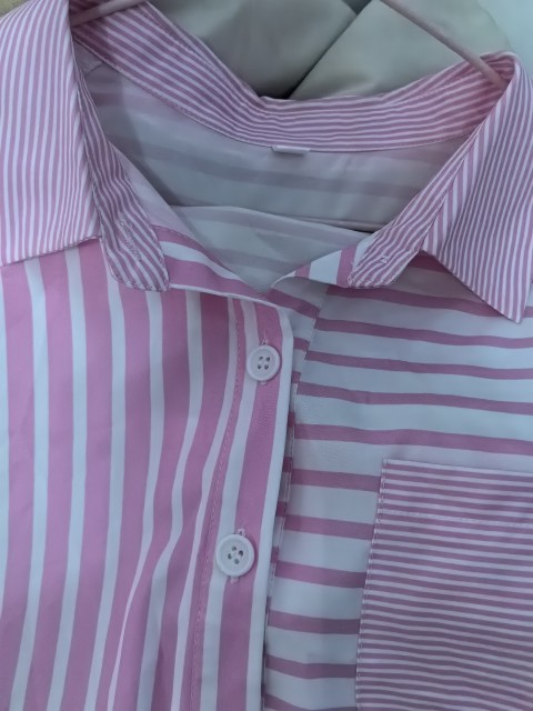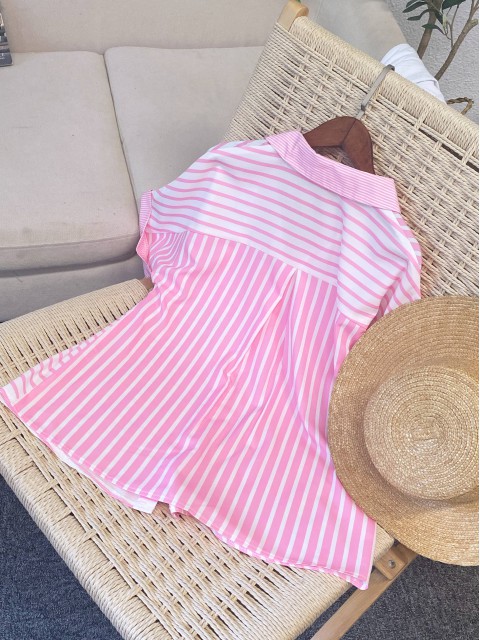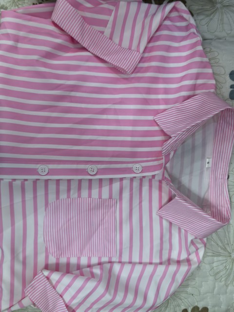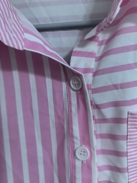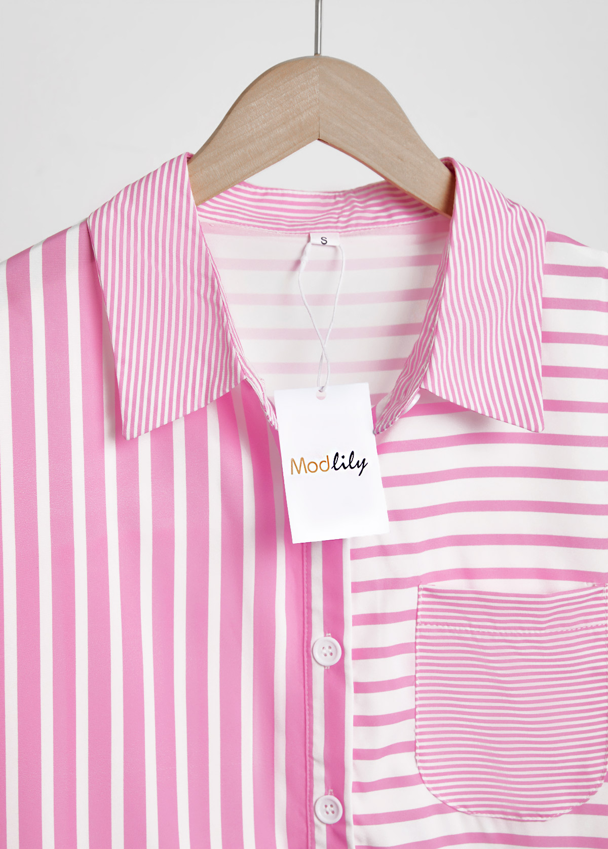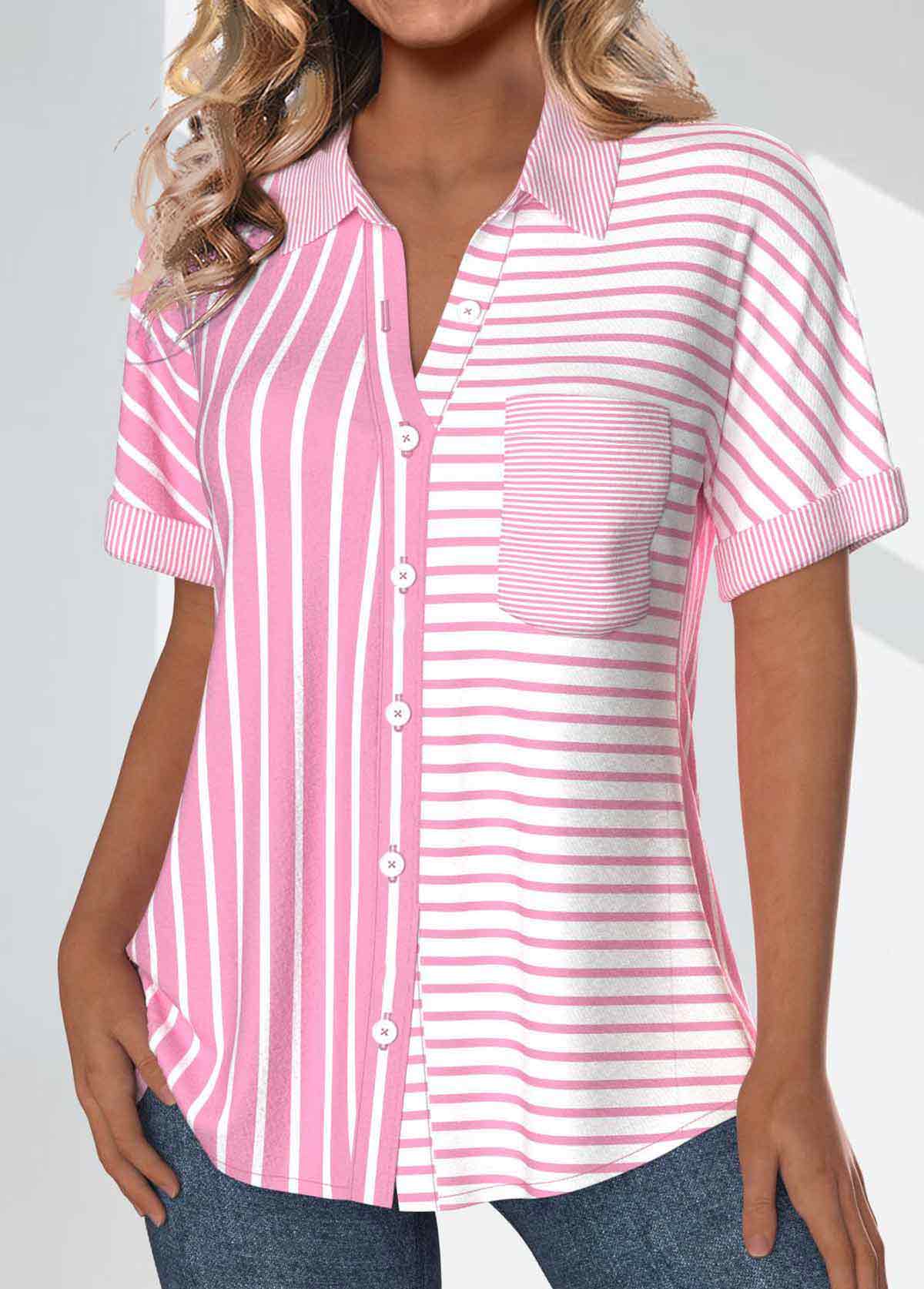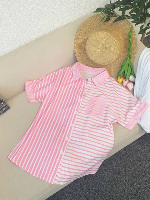 This pink short-sleeved shirt blends style and utility with fine stripes against soft fabric. Adorned with a chest pocket and delicate buttons, it exudes sophistication and boosts confidence. With tummy coverage for comfort, it's perfect for everyday or casual wear, showcasing your unique style.