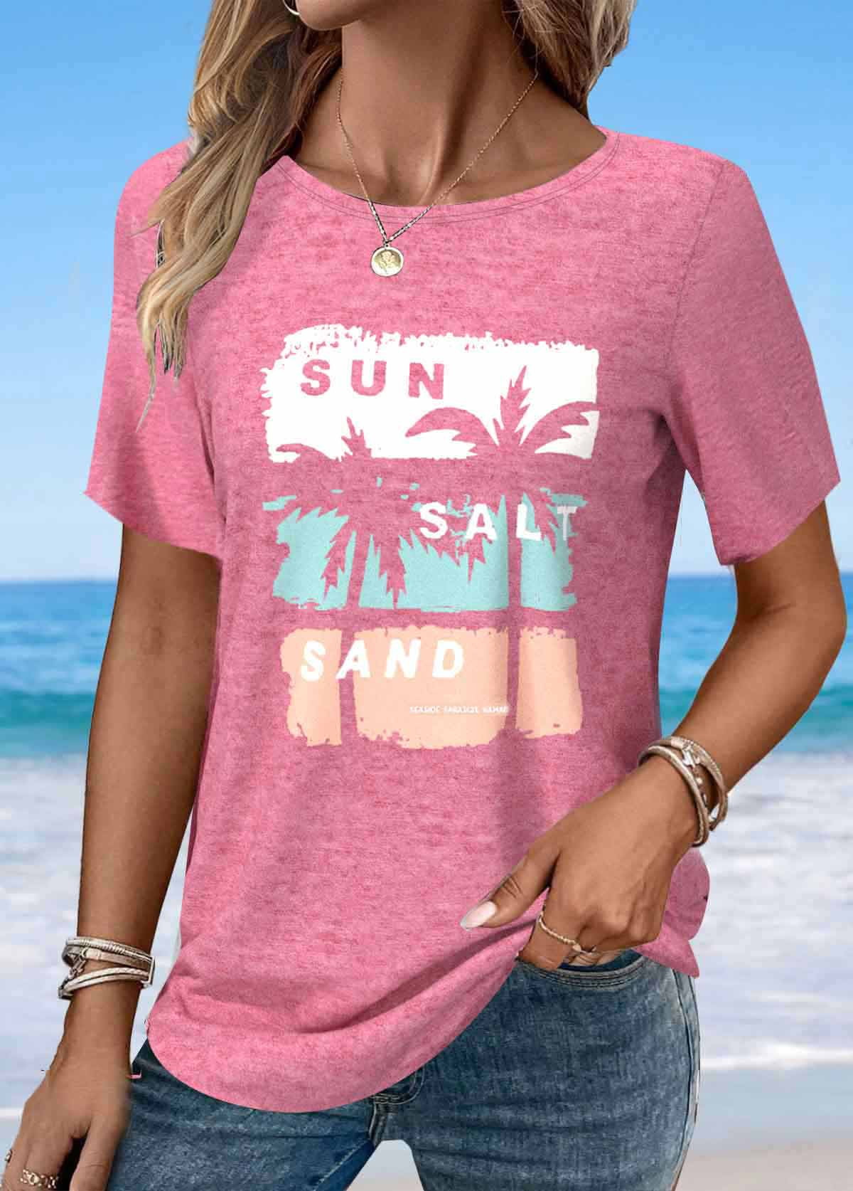 Pink Tropical Plants Print Twist Short Sleeve T Shirt