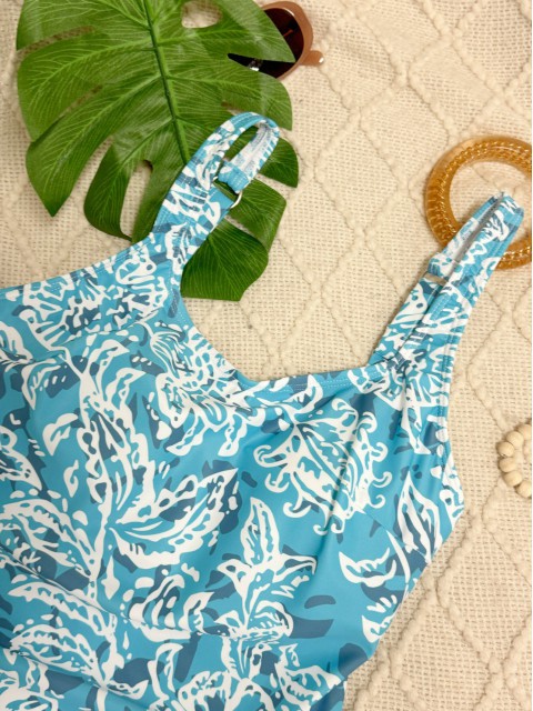 Drawstring Tropical Plants Print Cyan One Piece Swimwear