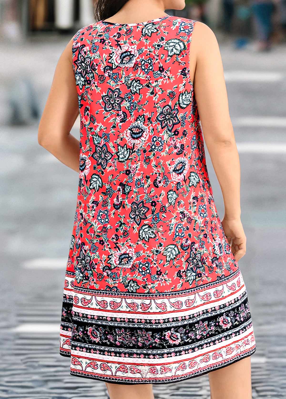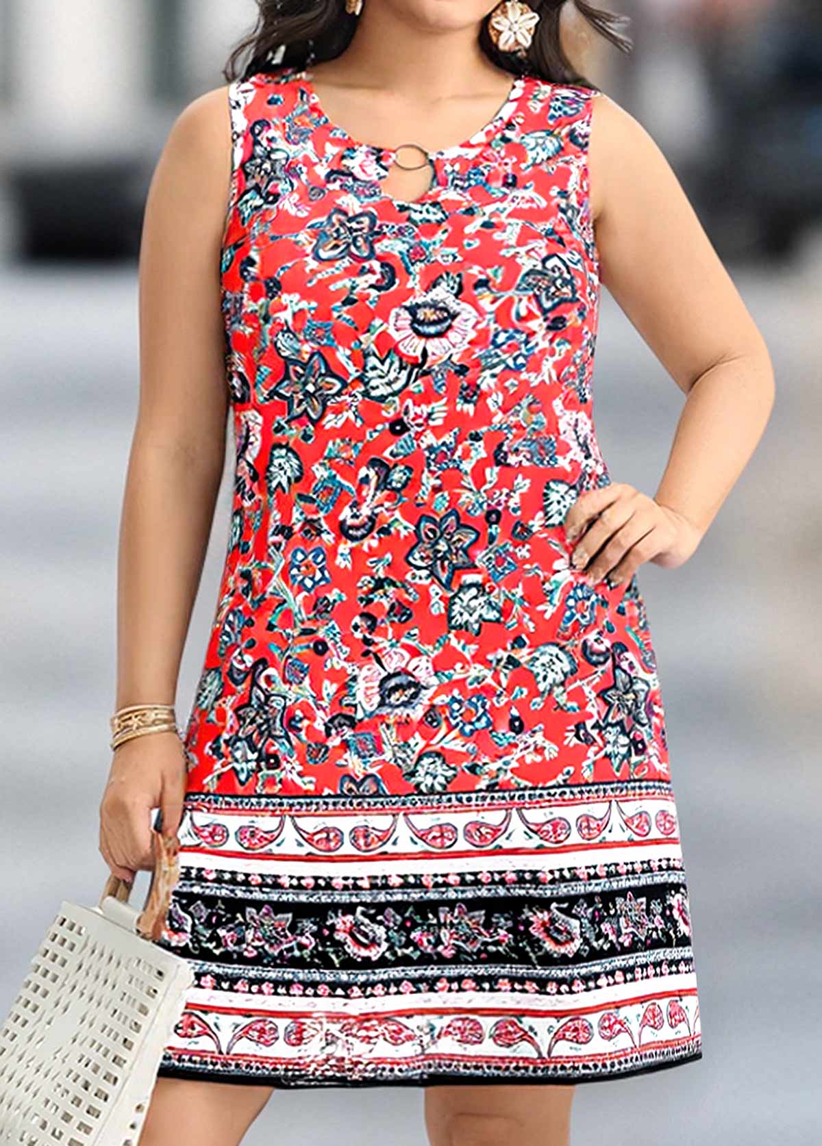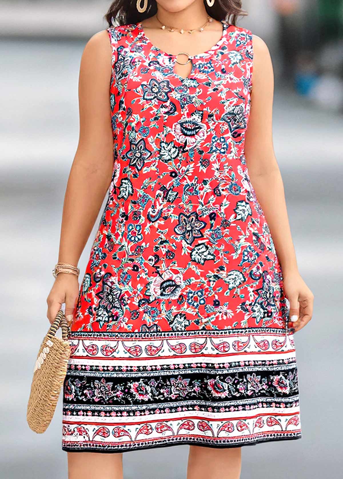 Picture yourself in a coral-hued tribal dress, its vibrant color echoing tropical sunsets. This sleeveless knee-length dress features a striking circular ring detail at the chest and an X-shaped cut that elegantly hides the midsection. The skirt's patchwork design, adorned with intricate patterns, adds a playful touch, perfect for vacationing in style.