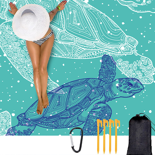 Large beach mat w spikes for corners. Adorable turtle print.