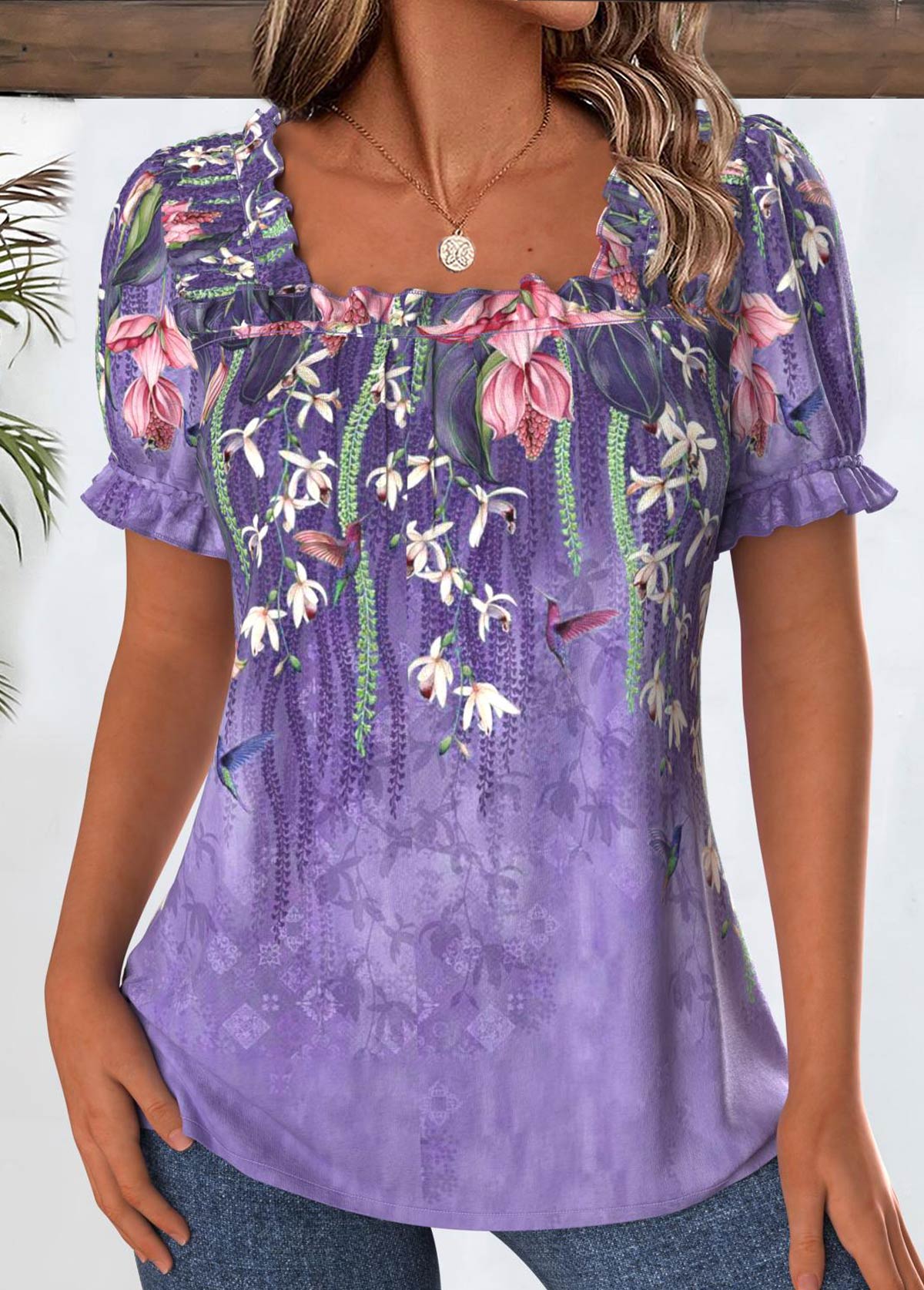 Pink Floral Print Tummy Coverage Short Sleeve T Shirt