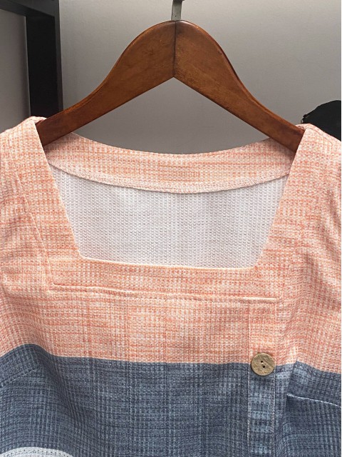 Navy Patchwork Striped 3/4 Sleeve Split Neck Blouse