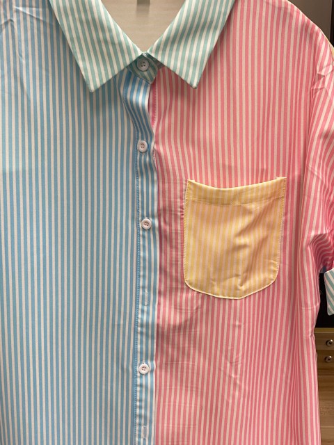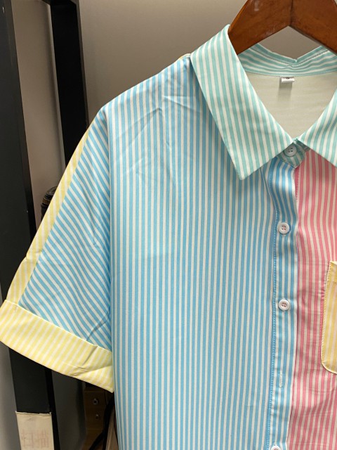 Multi Color Pocket Plaid Short Sleeve Shirt Collar Blouse