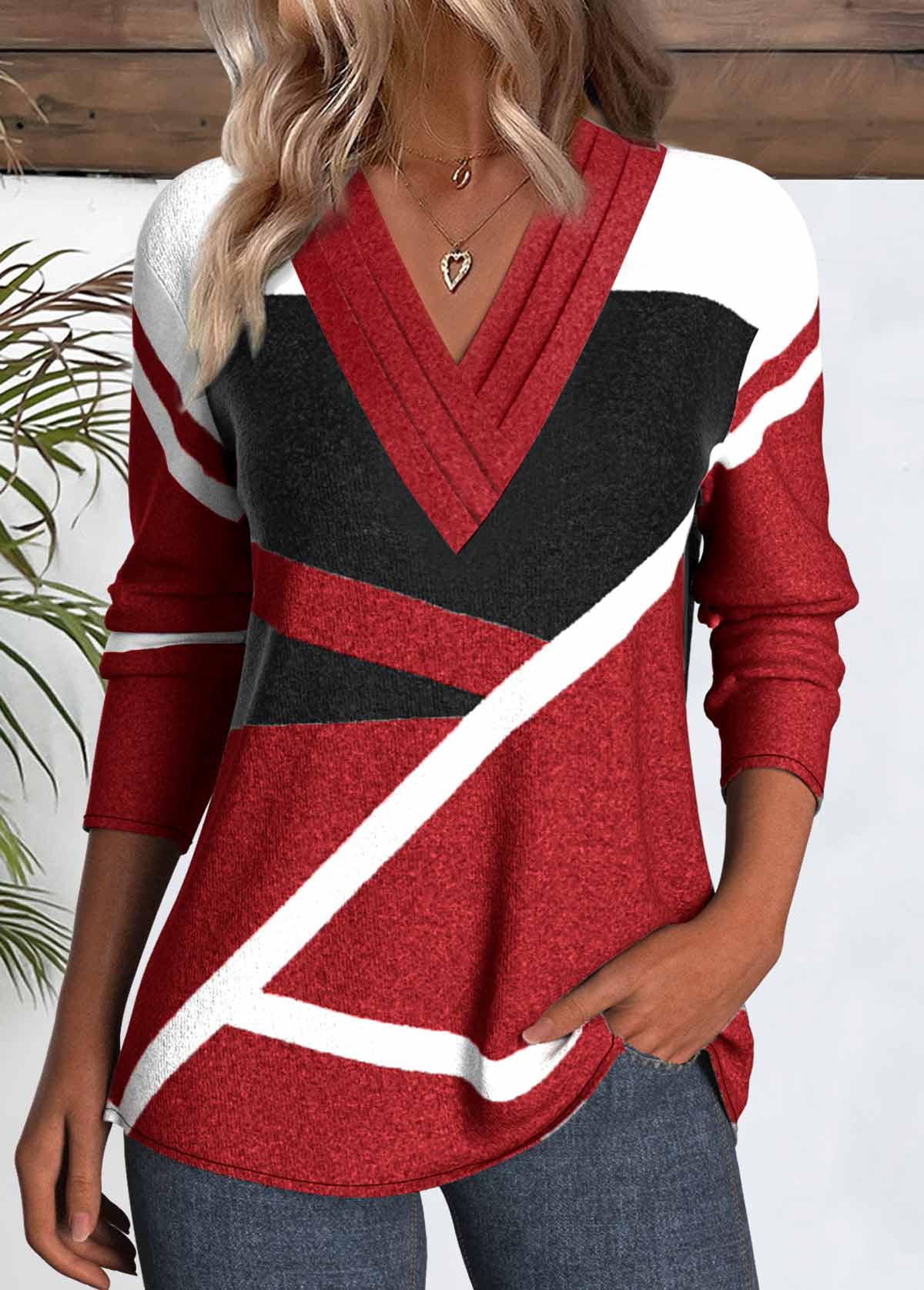 women's clothes / Tops / Tees&T-shirts  /  Red Patchwork Geometric Print Long Sleeve T Shirt