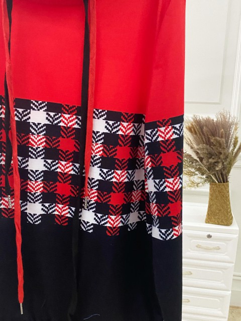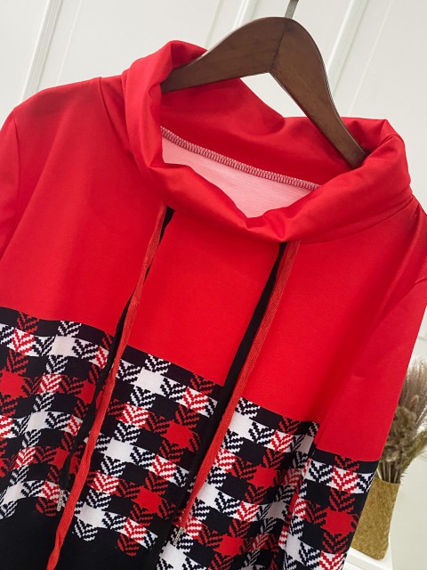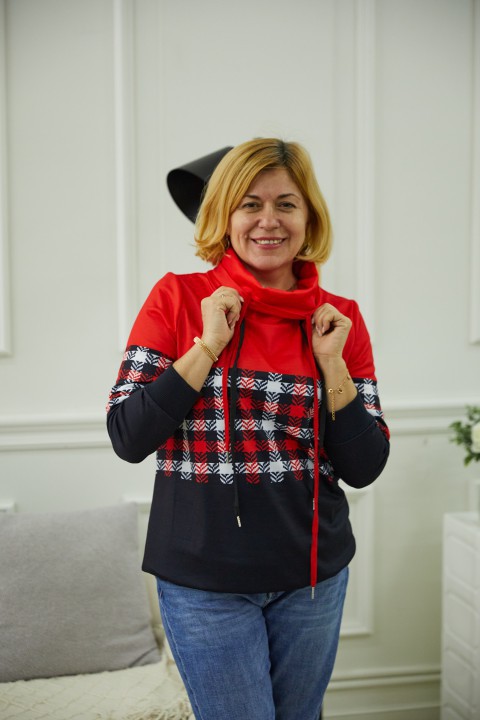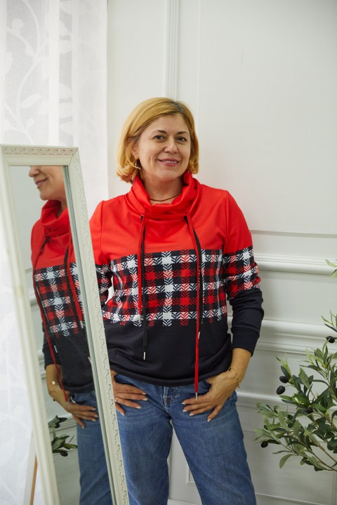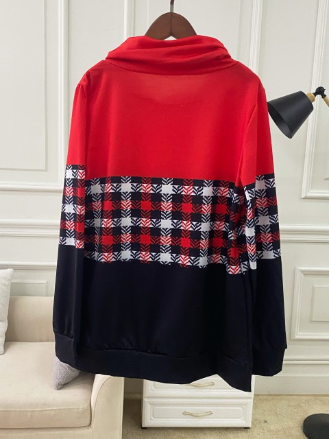 Deep Red Patchwork Plaid Long Sleeve Sweatshirt