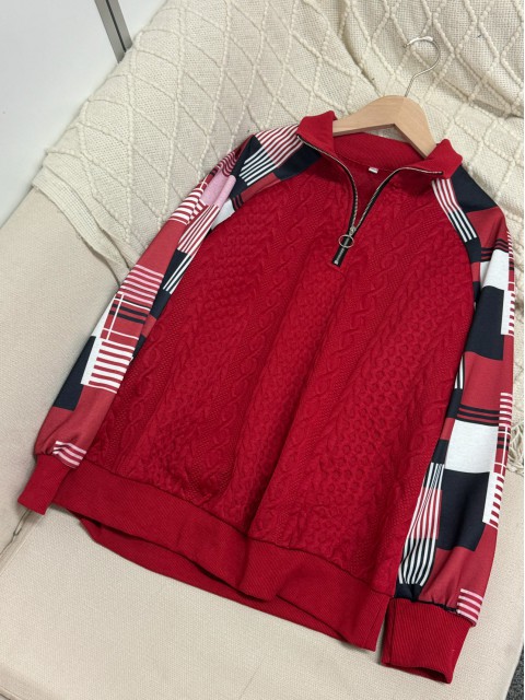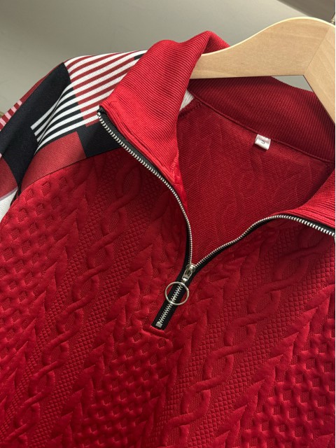 Unwrap cozy vibes with this festive plaid sweatshirt! Featuring a geometric patchwork design on the sleeves and a stylish zip-up collar, it effortlessly blends casual charm with holiday spirit. Made from soft knit fabric, its mid-length cut offers perfect tummy coverage, making it ideal for everyday wear or festive outings.