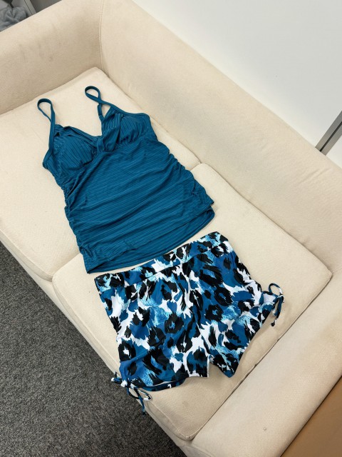 Behold the Tankini set, where allure meets comfort. The top features removable pads and adjustable straps, with a surplice front and delicate ruched detailing for a chic twist. Paired with bottoms adorned in a captivating leopard print, it exudes a blend of sensuality and charm. Ideal for vacations, its flattering silhouette ensures confidence with every wear. Perfect for resort.