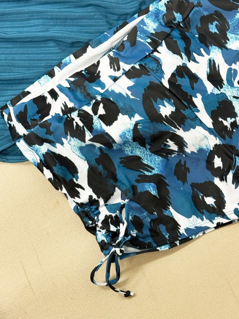 Mid Waisted Leaf Print Royal Blue Tankini Set