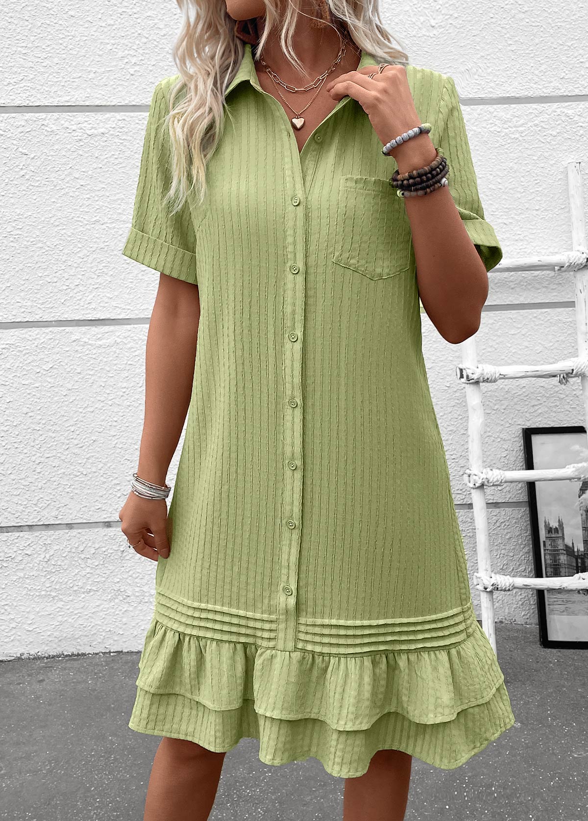 women's clothes / Dresses  /  Sage Green Button A Line Short Sleeve Dress