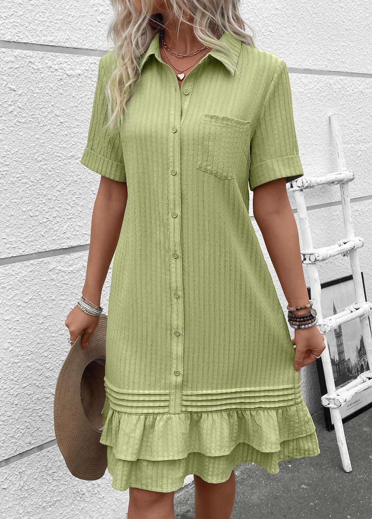 Sage Green Button A Line Short Sleeve Dress