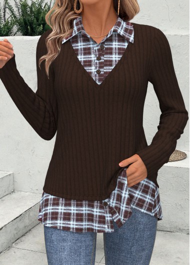Light Coffee Button Plaid Long Sleeve Shirt Collar Blouse