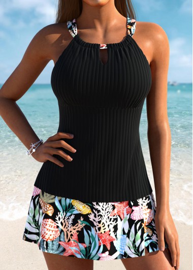 Mid Waisted Tropical Plants Print Black Tankini Set