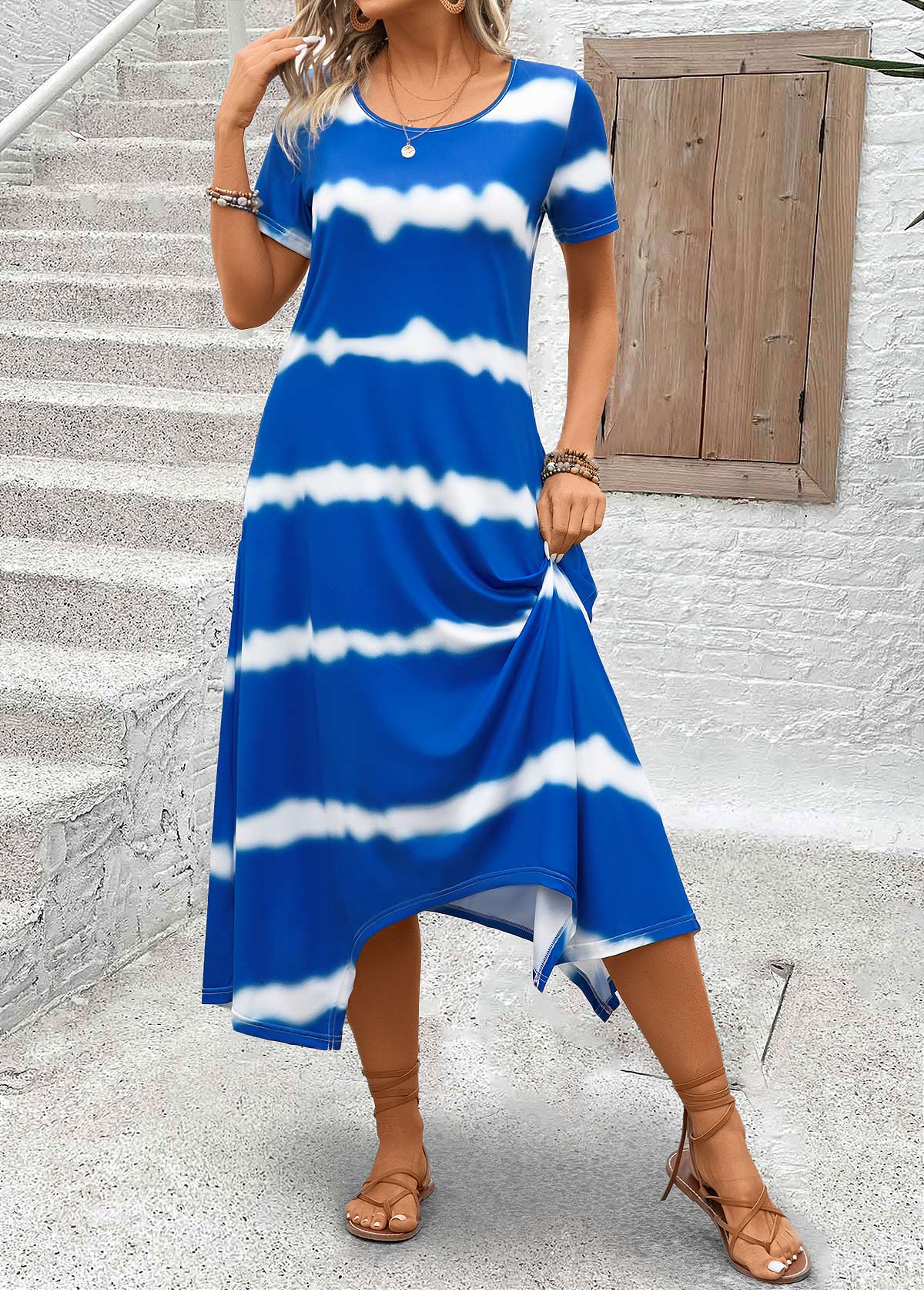 Dusty Blue Striped Shirred Short Sleeve Round Neck Dress