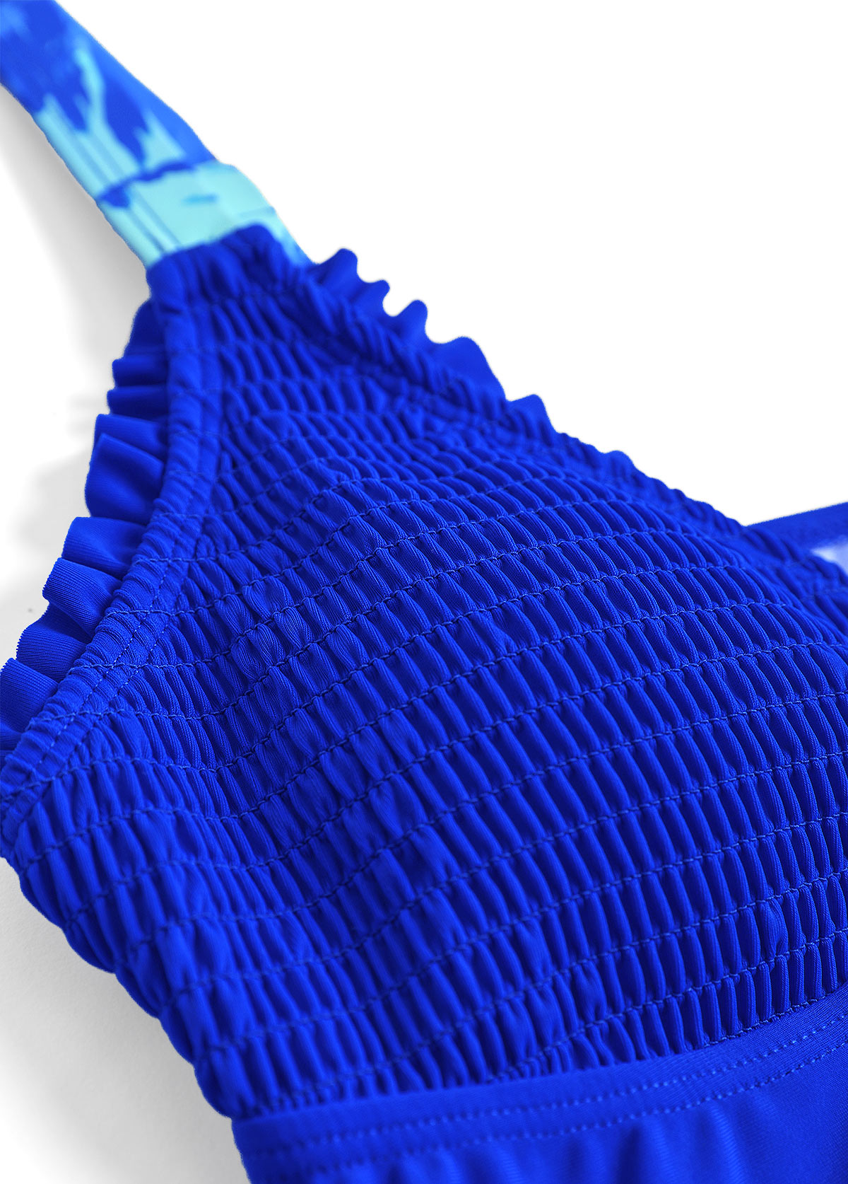 Step into tropical paradise with this royal blue tankini set. The top features removable padded cups, adjustable straps, and stylish smocked detailing for a comfortable yet flattering fit with added tummy coverage. Paired with vibrant boyshorts in a bold tropical plant print, this set is perfect for a breezy, carefree beach vacation. Embrace comfort and style while you soak up the sun!