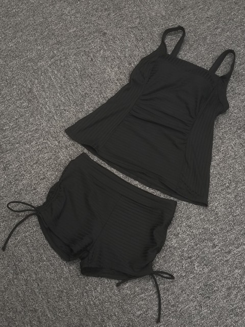 Tummy Coverage Tropical Plants Print Black Tankini Top