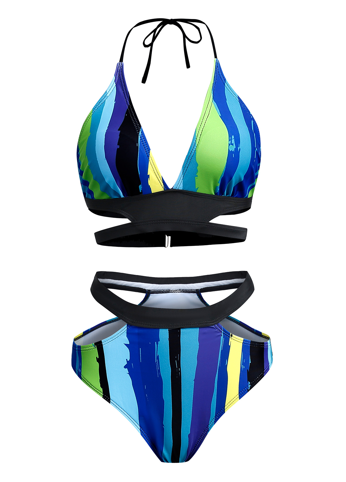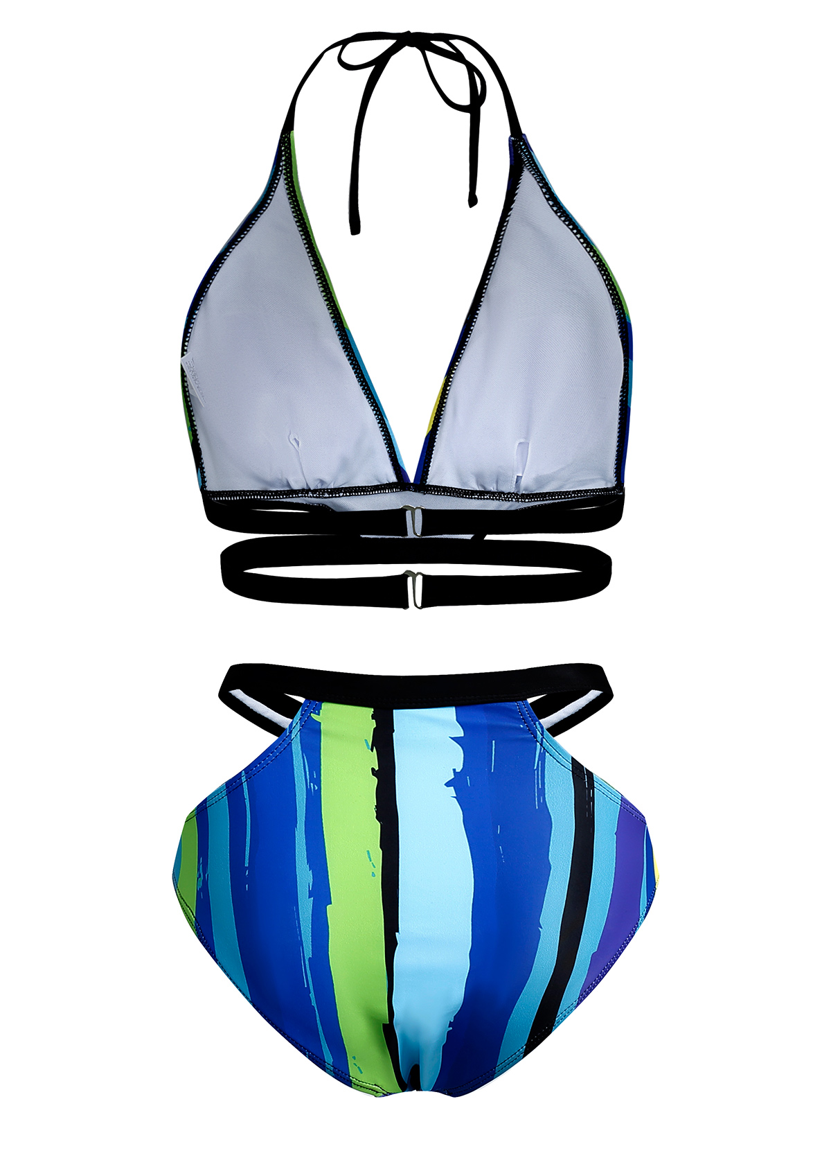 Ruched Mid Waisted Striped Multi Color Bikini Set