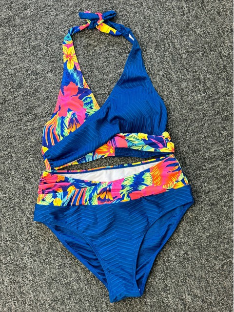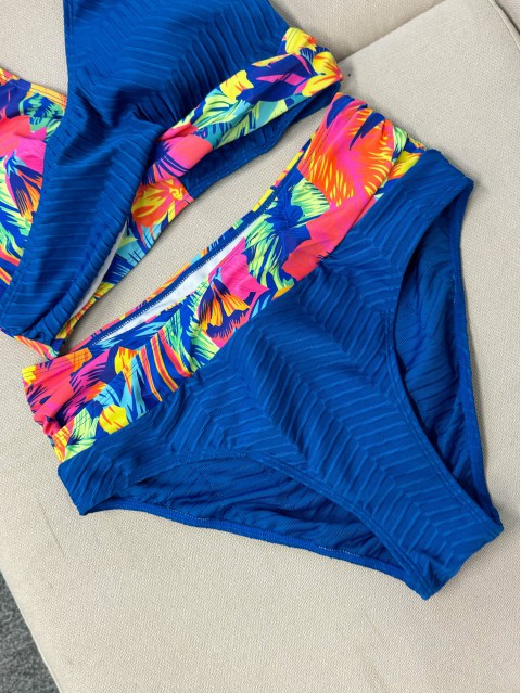 Prepare to embrace vacation vibes with our royal blue botanical floral print bikini set! Surplice front and patchwork halter design make it a standout. Crafted from jacquard fabric with wide waistbands and stretchy elasticity, it blends style with comfort. Adjustable straps and removable pads ensure a customized fit. Perfect for a fun-filled getaway!