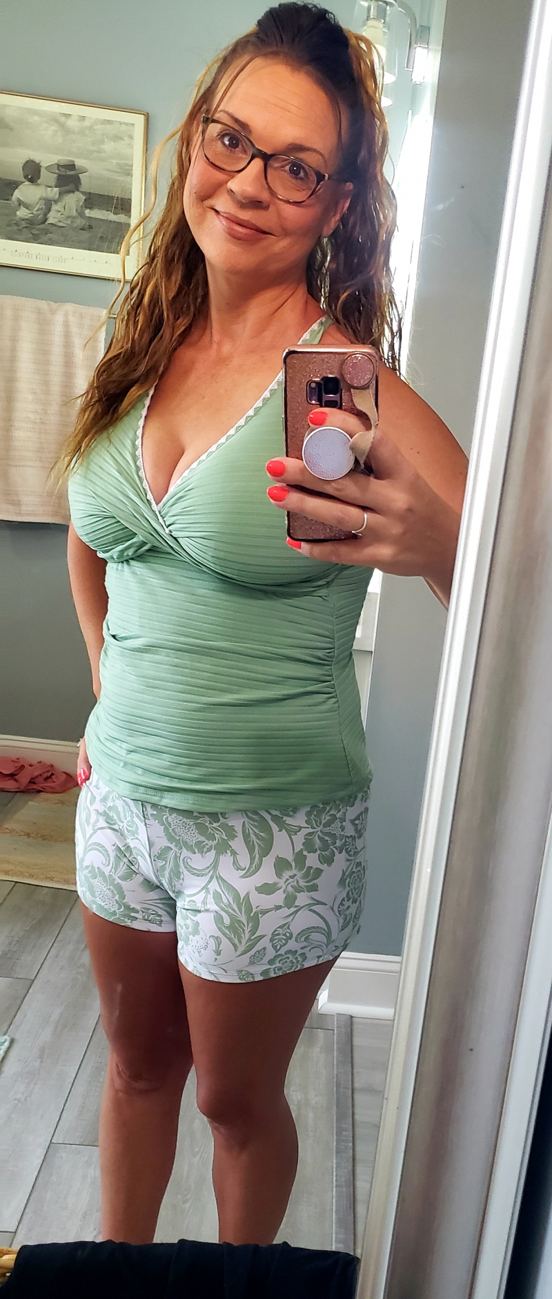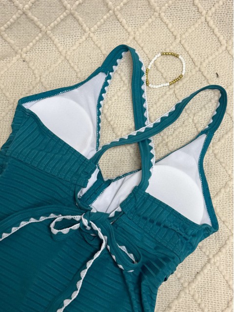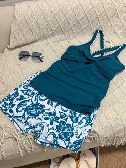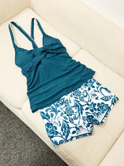 Dive into retro charm with this refreshing sage green tankini set! The surplice front of the top adds a twist of flair, complemented by adjustable crisscross straps featuring cute knot details. Removable pads and ruched tummy coverage ensure both style and comfort. Paired with vintage floral print square-cut bottoms, it exudes a breezy vacation vibe you'll love!