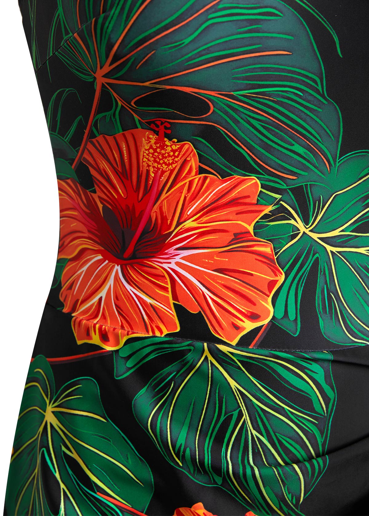 Bloom with elegance in this black one-piece swimsuit, adorned with trendy yellow floral prints. A lace-trimmed neckline adds a charming touch, while high-stretch fabric, side ties, and a modest hemline that covers the hips ensure both comfort and coverage. Perfectly stylish yet demure.