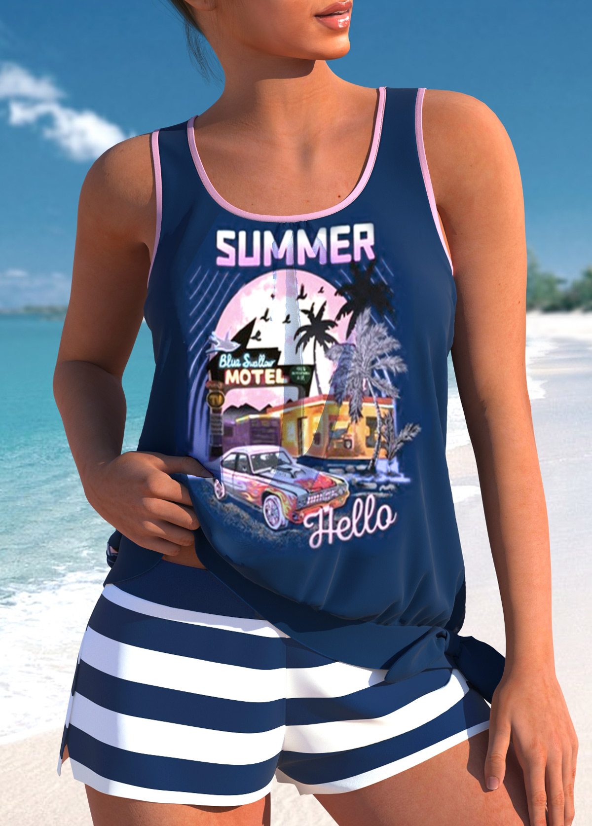 Tummy Coverage Mid Waisted Striped Navy Tankini Set
