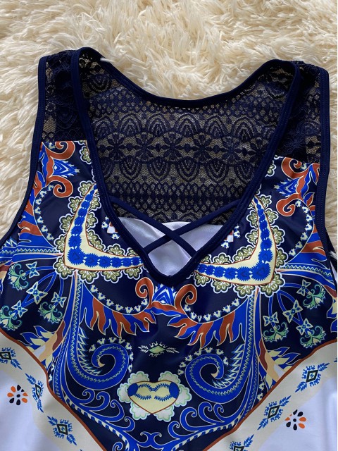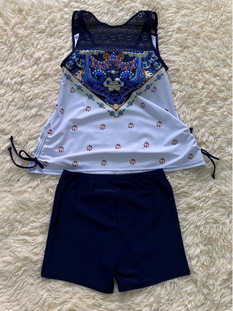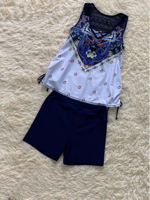 Mid Waisted Leaf Print Royal Blue Tankini Set