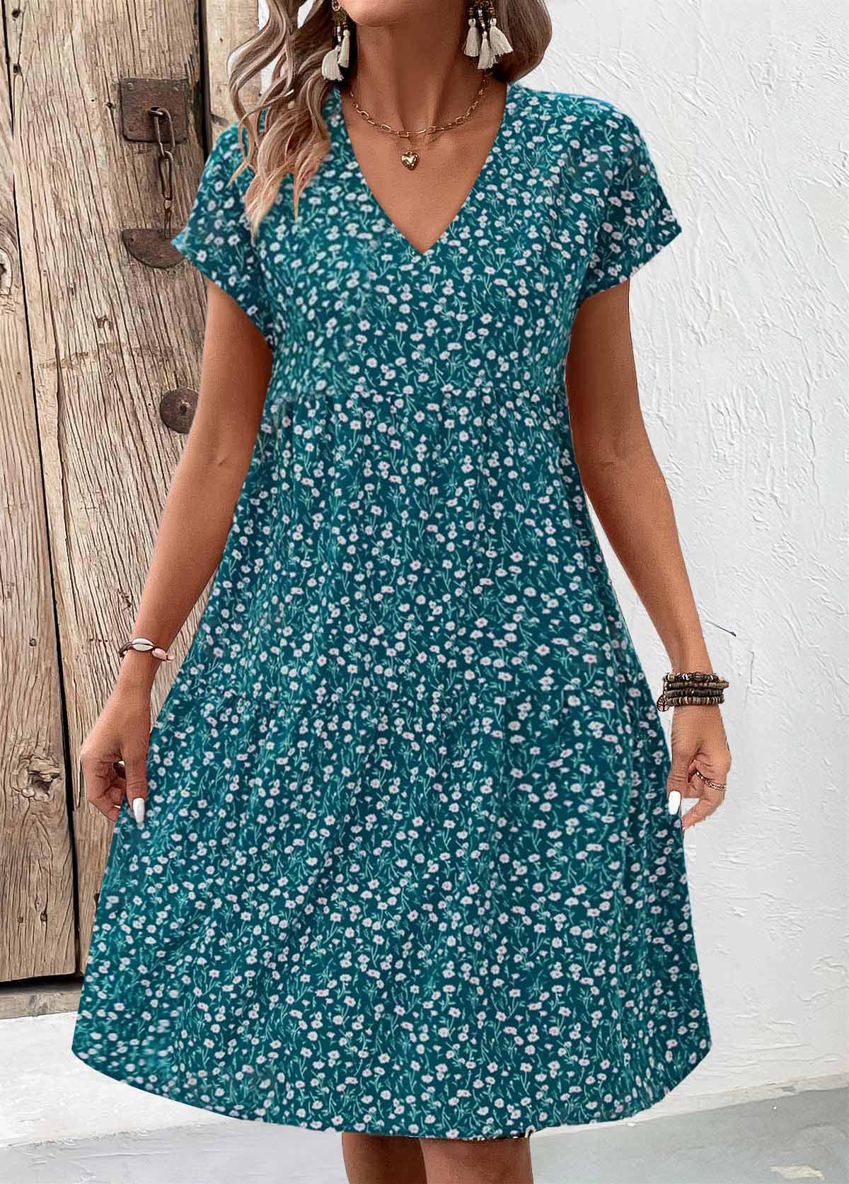 Turquoise Patchwork Floral Print A Line Short Sleeve Dress