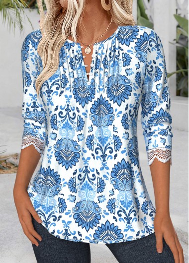 Blue Tummy Coverage Floral Print Half Sleeve Blouse
