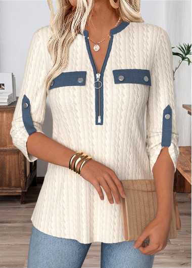 Beige Curved Hem 3/4 Sleeve Split Neck Blouse